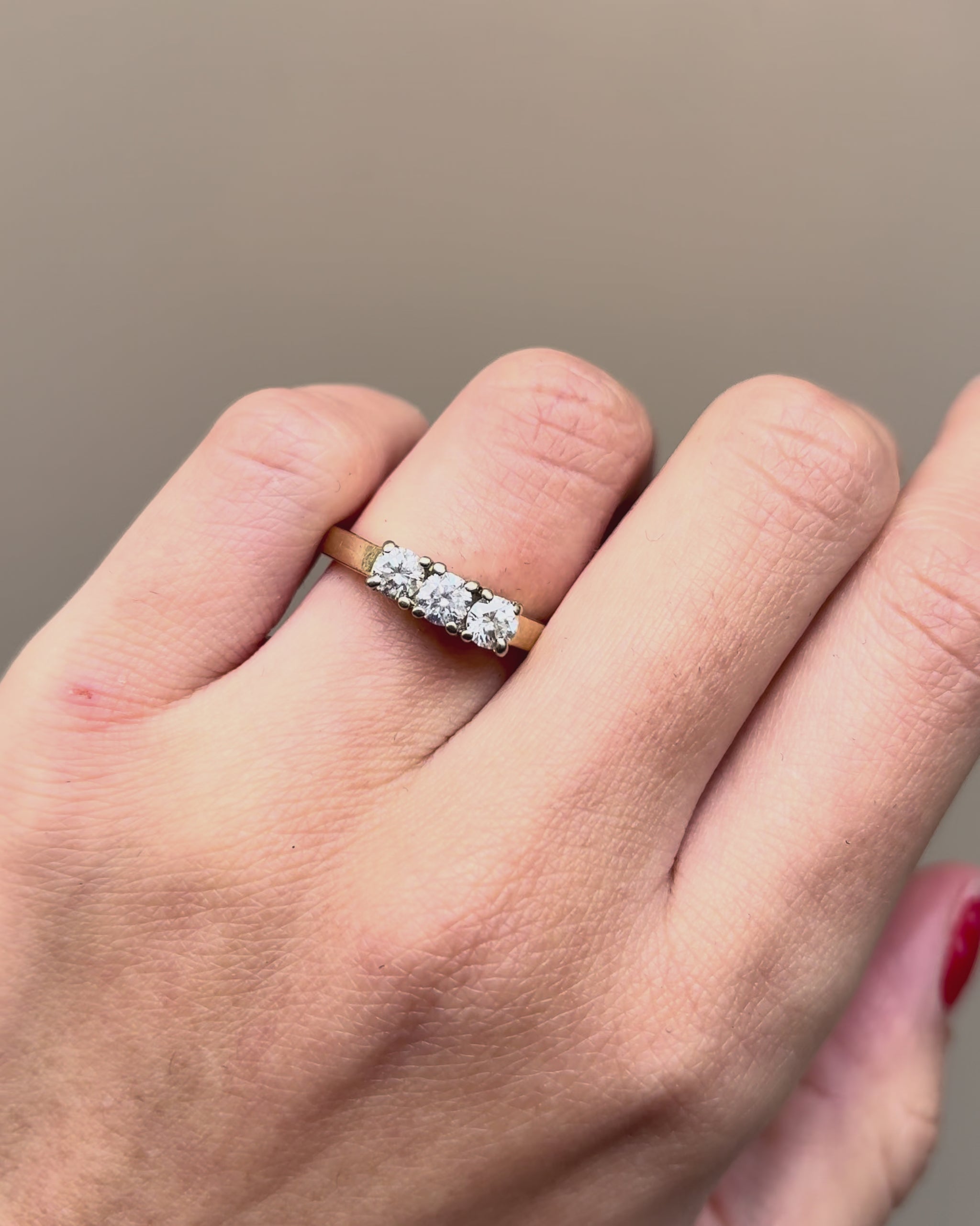 "Simone" est une magnifique bague trilogie vintage en or jaune 18 carats. Finement façonnée dans les années 1970, elle est le fruit du travail d'un maître joaillier de précision. En son cœur sont sertis trois magnifiques diamants de 0.75 carat au total, d'un magnifique éclat.