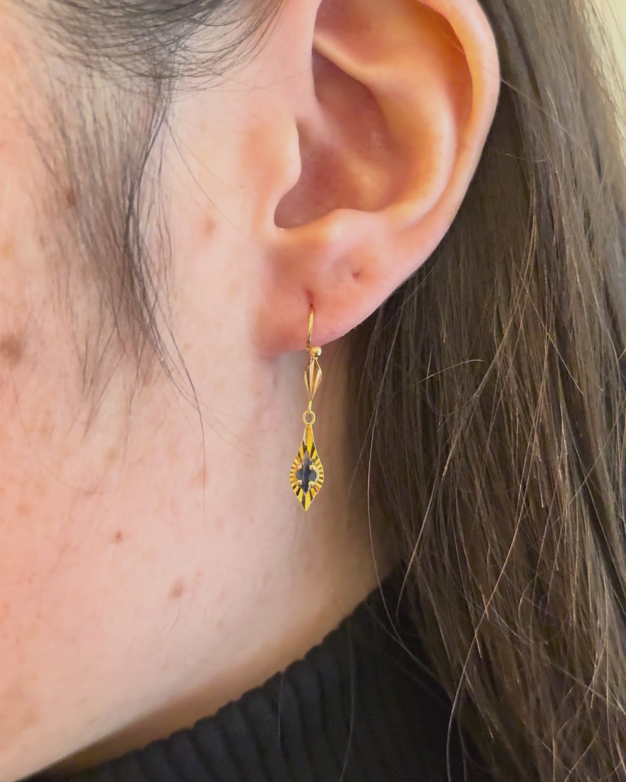 "Mélissa" sont de sublimes boucles d'oreilles dormeuses en or jaune 18 carats. Leur design très délicat reflète le travail d'un maître joaillier d'exception. Au cœur d'un motif finement ciselé, qui leur confère une brillance magique, sont sertis deux beaux saphirs taille marquise de 0.55 carat au total.