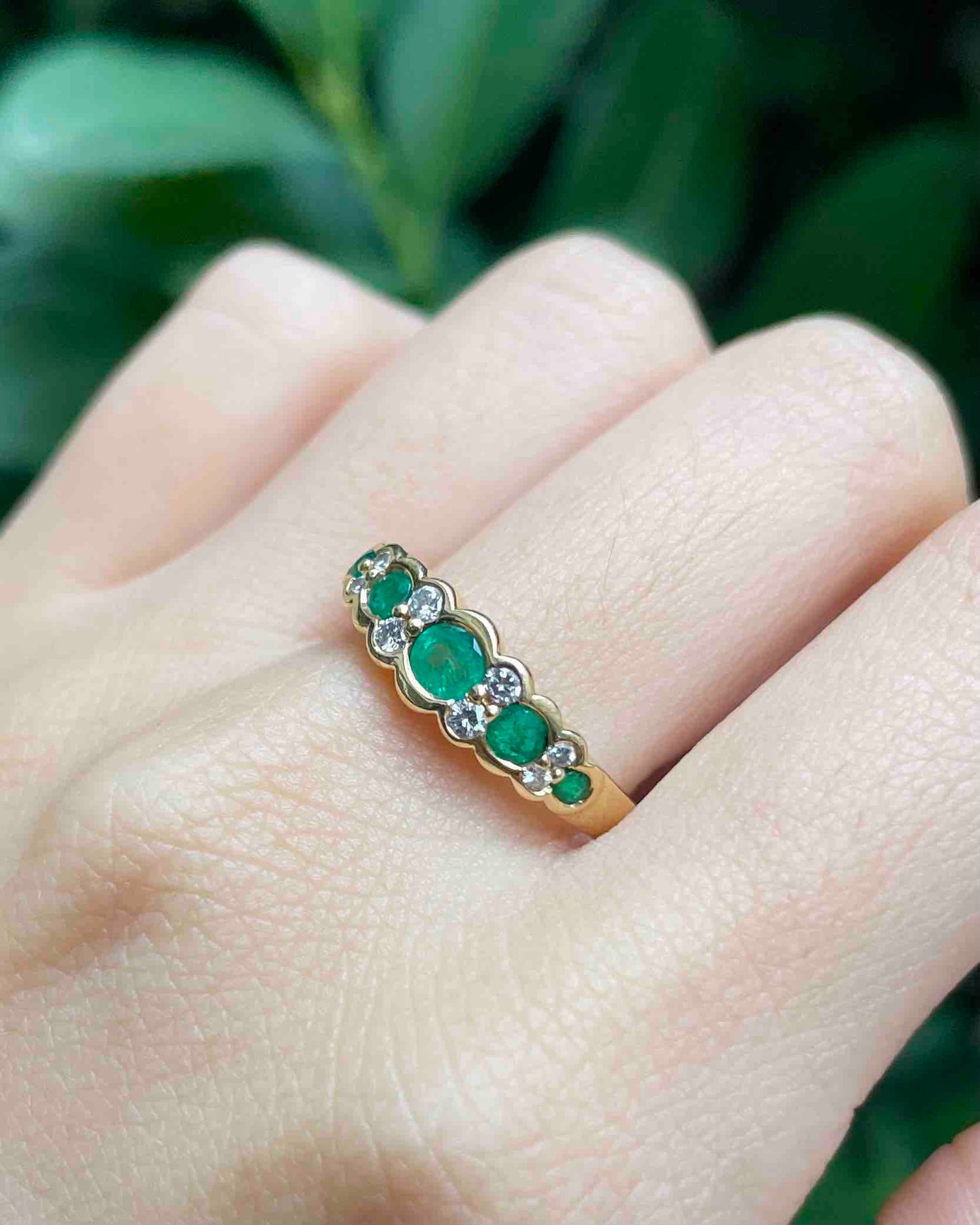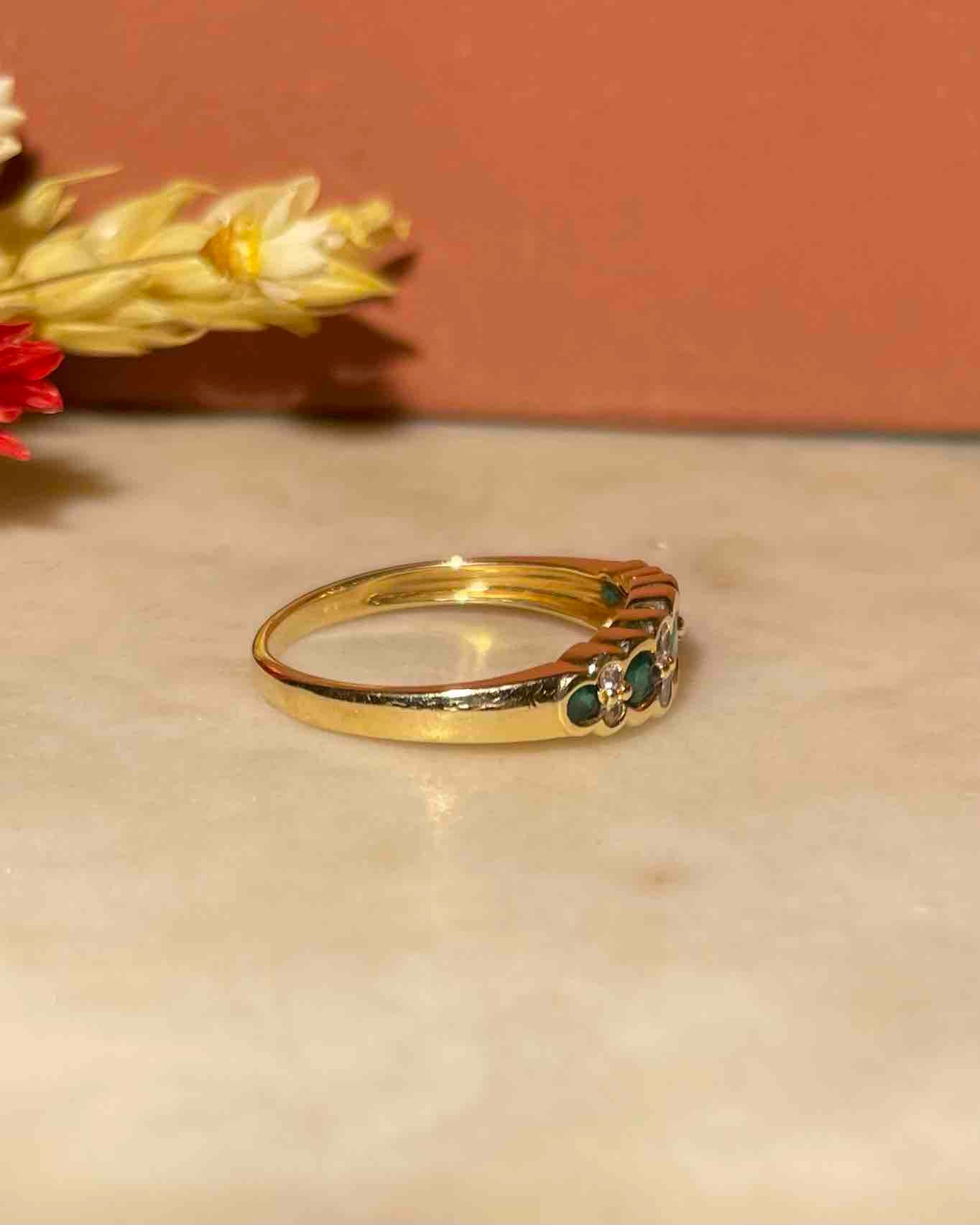 An exceptional piece of jewelry that combines the timeless brilliance of diamonds, the vibrant color of emeralds, and the luxury of 18-carat yellow gold, this vintage river ring is a true statement of sophistication.