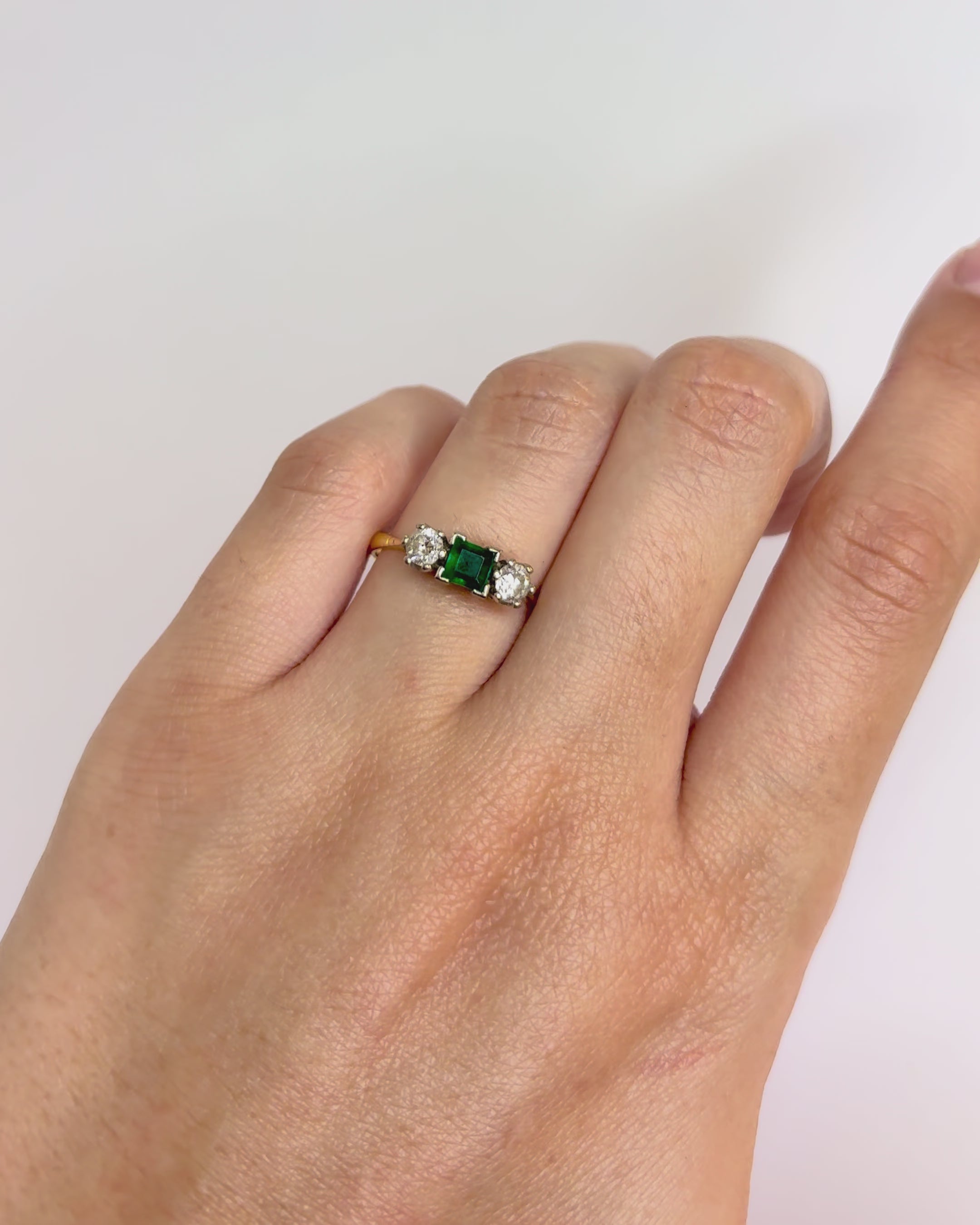 "Rafaella" is a magnificent trilogy ring, a sublime vintage creation from the 1950s in 18-carat yellow and gray gold. It features at its heart a beautiful 0.36-carat emerald, flanked by two diamonds totaling 0.30 carat.