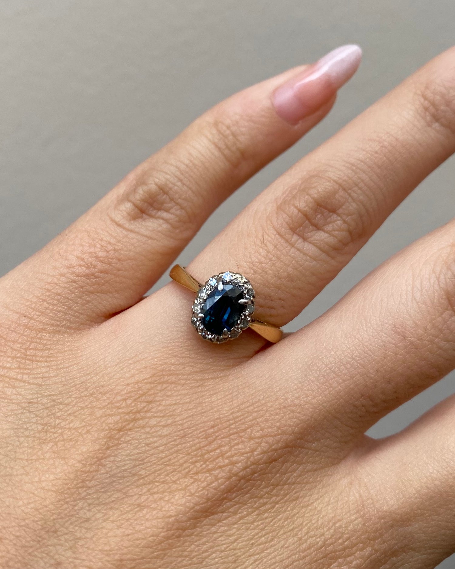 La bague "Clea" est une création de maître marguerite emblématique des années 1960, façonnée en or jaune et gris 18 carats. Elle met en valeur un somptueux saphir bleu profond de 1.05 carat, entouré de 12 diamants brillants totalisant 0.24 carat.