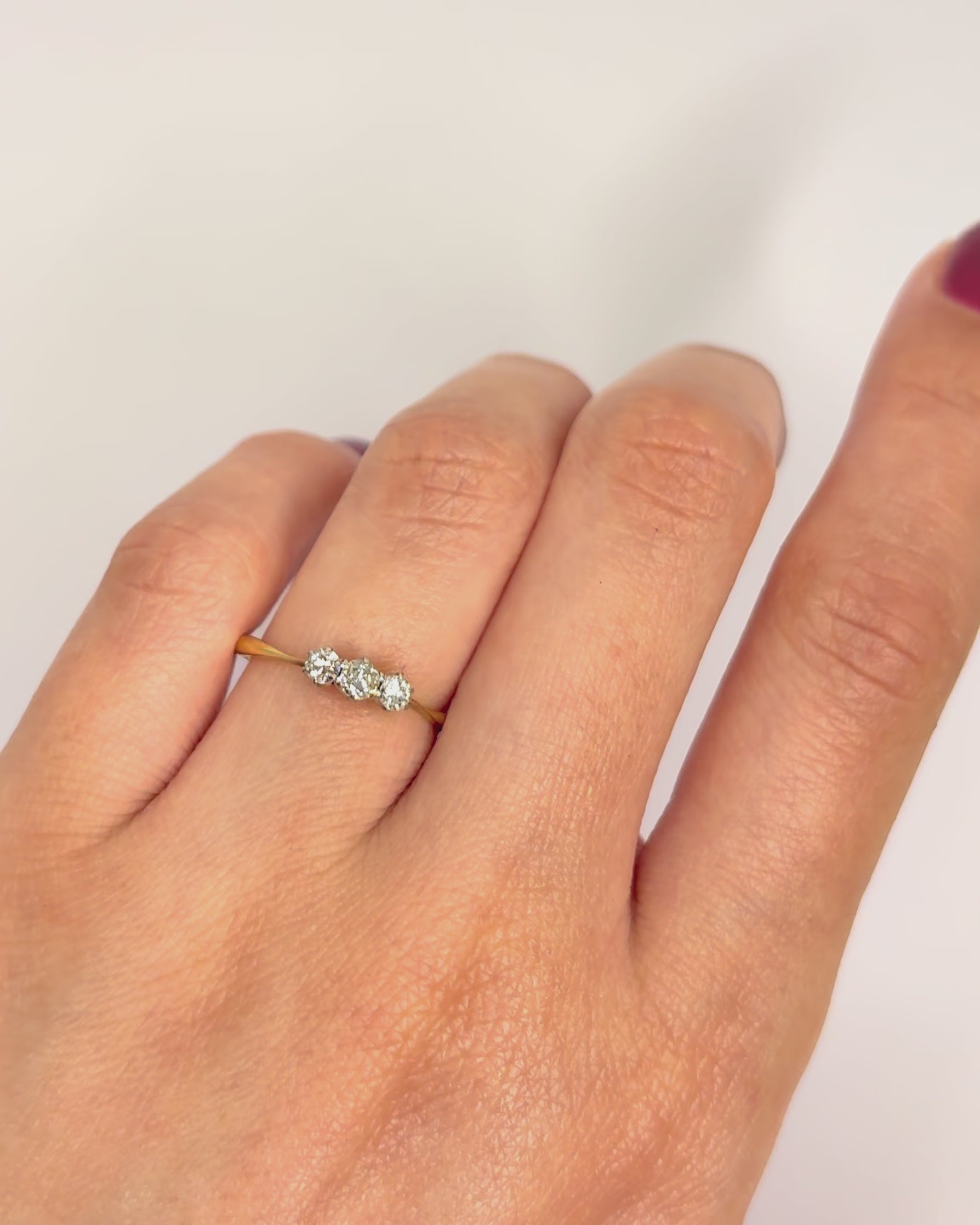 "Fiona" es un magnífico anillo trilogía antiguo, elaborado en oro amarillo de 18 quilates y platino en los años 1970. Está engastado con tres diamantes brillantes que suman 0.12 quilates, lo que le otorga a este anillo una elegancia sutil y un encanto eterno.