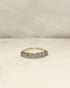 Ce modèle incarne à merveille le style vintage raffiné des années 70, où les contrastes d’or et la brillance des diamants subliment la main avec discrétion et éclat. À la fois délicate et lumineuse, cette demi-alliance peut se porter seule, empilée ou en bague de mariage.