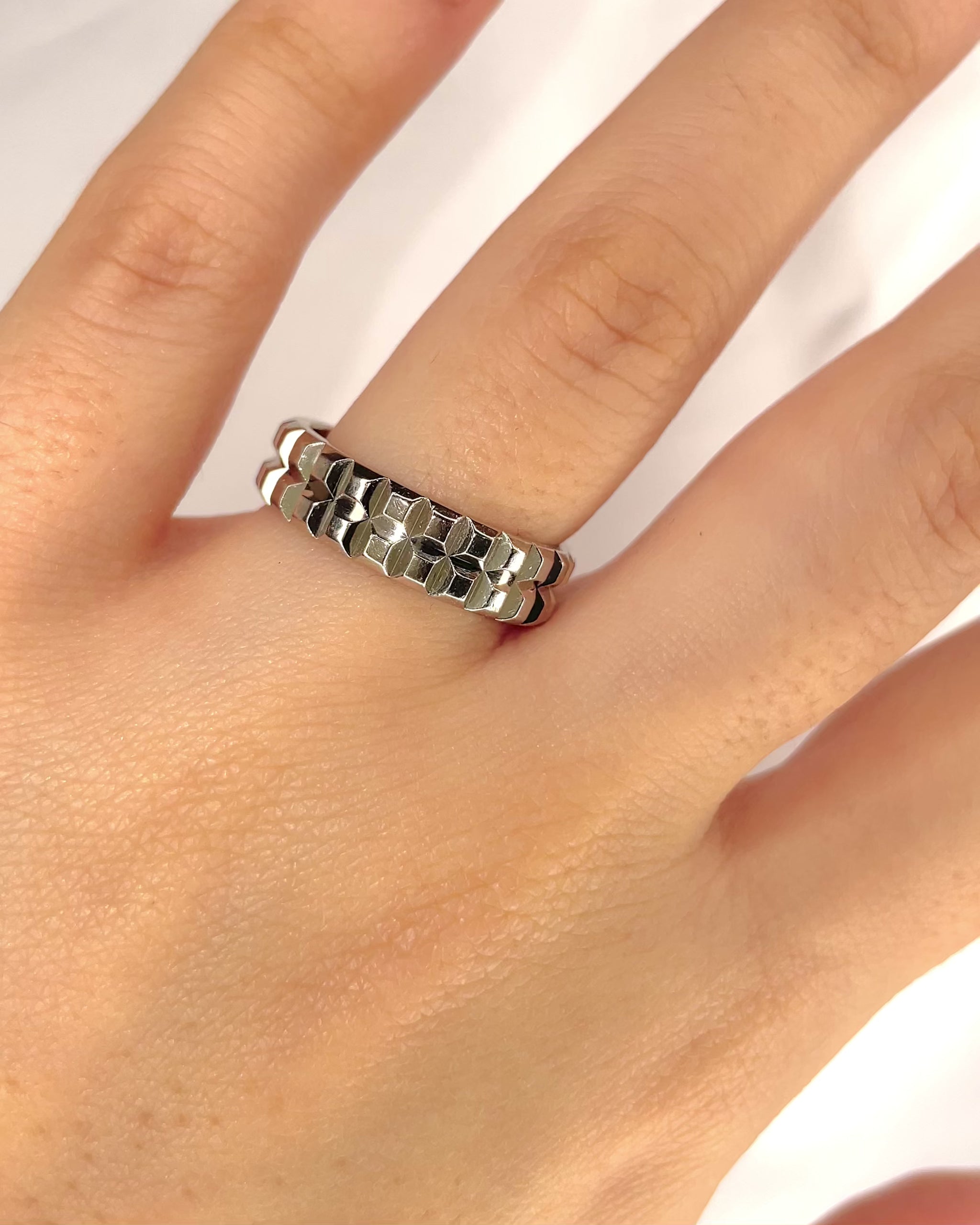 El motivo "Clou de Paris" es un diseño emblemático, inspirado en los adoquines históricos de la Plaza Vendôme en París, donde Boucheron está establecido desde el siglo XIX. Este motivo se reconoce por una textura geométrica facetada, que recuerda las pequeñas pirámides regulares de los adoquines, que juega magníficamente con la luz y da un relieve elegante a este anillo.