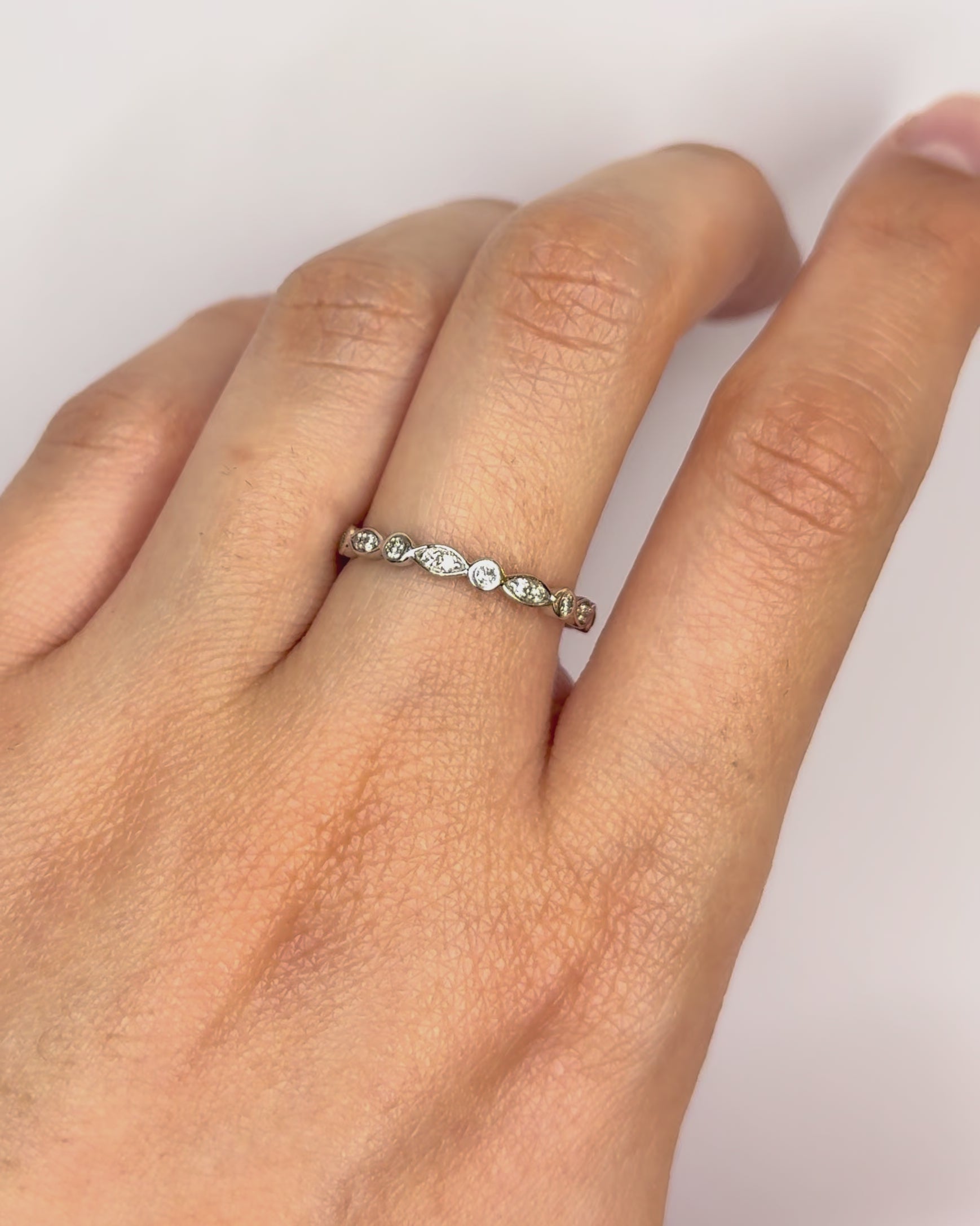 El anillo "Katleen" es una elegante media alianza vintage, elaborada en oro gris de 18 quilates. Está engastado con 13 diamantes que suman un total de 0.13 quilates, lo que le confiere un brillo muy refinado.
