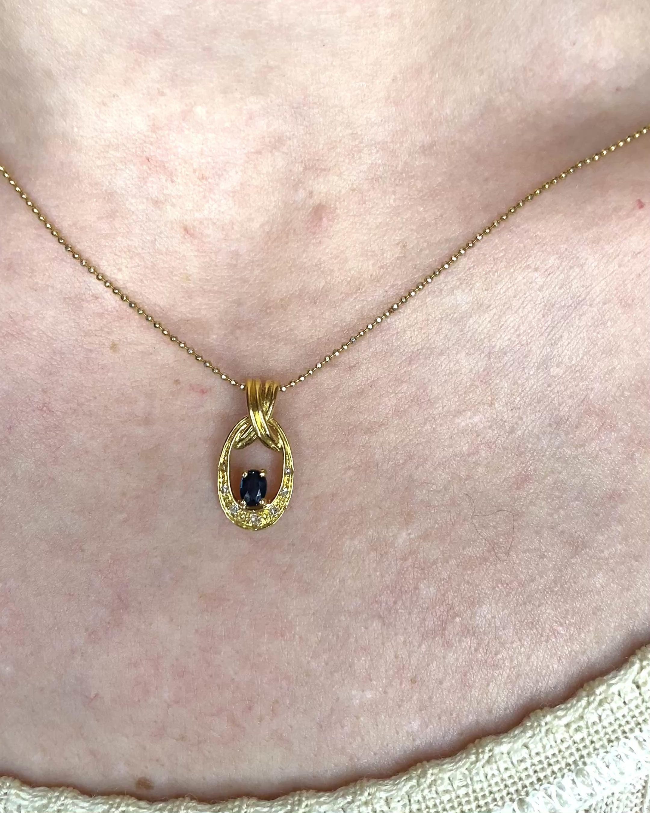"Magalie" es un elegante colgante vintage. En su centro se encuentra un sublime zafiro azul talla oval de 0.20 quilates, engastado con garras. Está acompañado por un delicado trabajo de oro amarillo de 18 quilates, finamente cincelado, que refleja un saber hacer joyero de precisión.