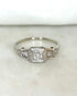 "Soline" est une bague Art Déco vintage, confectionnée en or gris 18 carats et platine. Son design géométrique aux détails très délicats est le reflet du minutieux travail d'un artisan français, dans les années 1930. Elle est sublimée par un diamant central de 0.15 carat, épaulé de 4 diamants taille rose totalisant 0.04 carat.