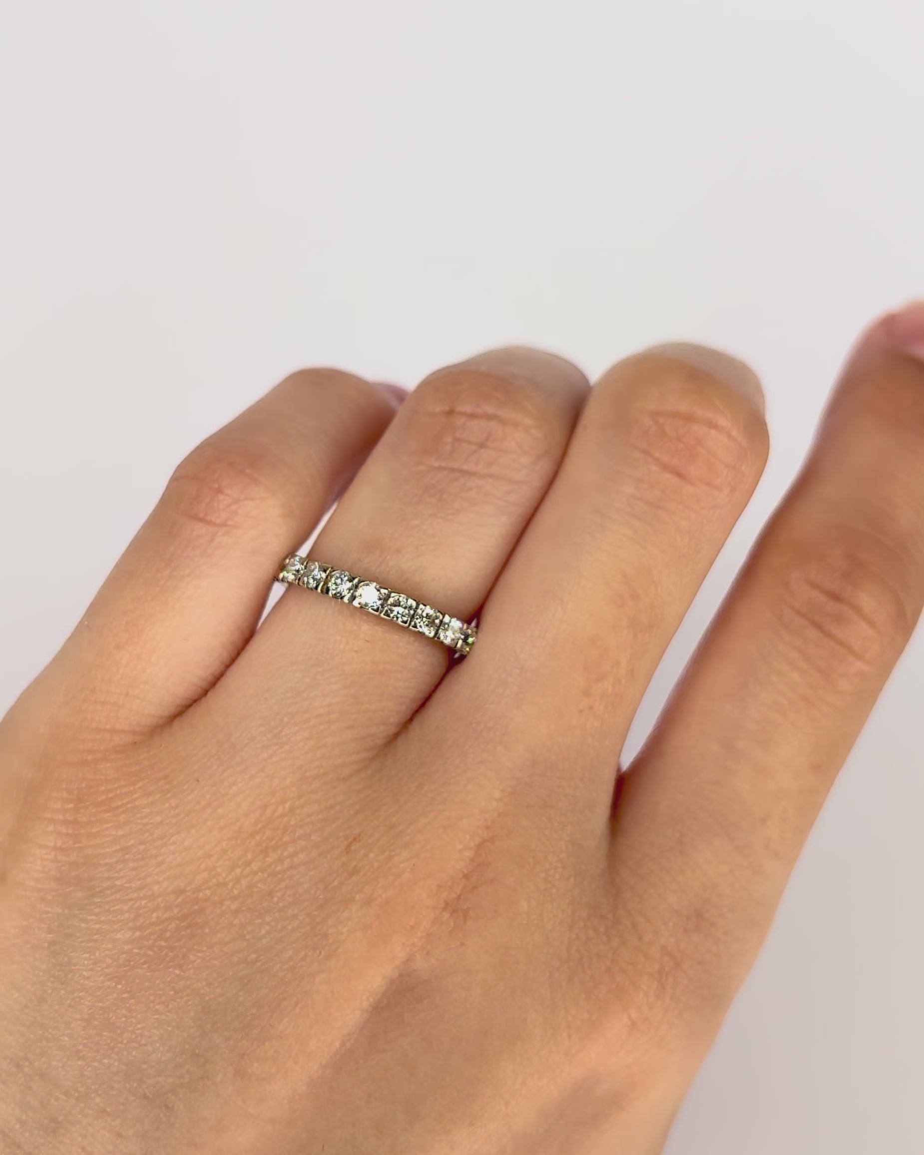 El anillo "Manon" es una elegante media alianza vintage de los años 1970, elaborada en oro gris de 18 quilates. Está engastado con 9 diamantes que suman un total de 0.36 quilates, lo que le confiere un brillo muy refinado.