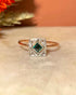 Su pieza central es una maravillosa esmeralda verde luminosa de 0,15 quilates. Rodeado de cuatro diamantes de talla rosa para un total de 0,04 quilates. Esta deslumbrante creación está montada en una bandeja de oro amarillo de 18k y platino, delicadamente colocada sobre una elegante banda de oro rosa de 18k.