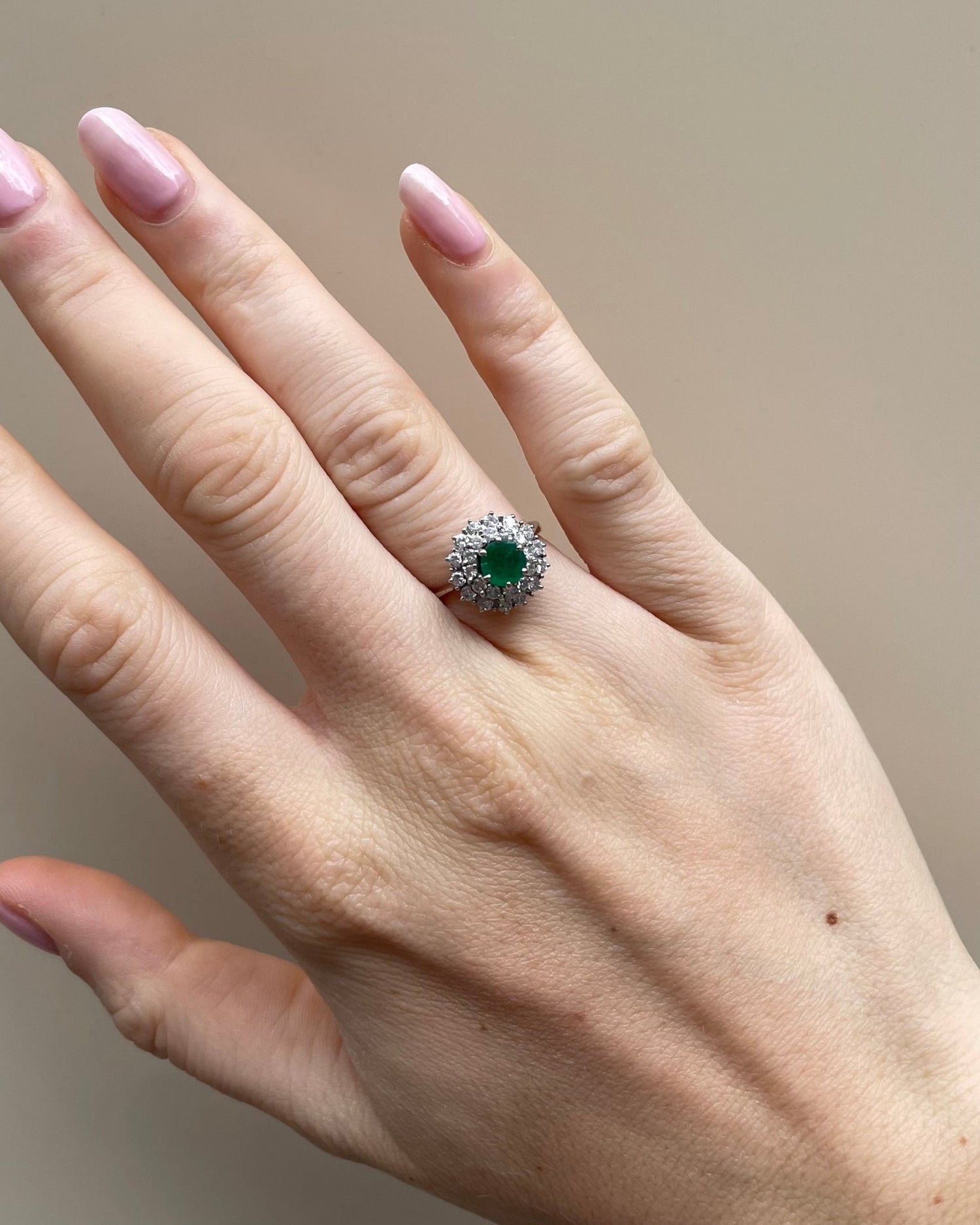 Façonnée en or gris 18 carats, elle met en valeur une émeraude centrale de 0.60 carat. Son entourage de 26 diamants, totalisant 0.52 carat, sublime l’ensemble avec un éclat raffiné et intemporel.