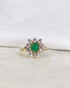 La bague "Elise" est une magnifique création vintage au style marguerite, façonnée en or jaune 14 carats. Elle met en valeur une sublime émeraude centrale de 0.35 carat, entourée d'un halo de 12 diamants étincelants totalisant 0.36 carat.