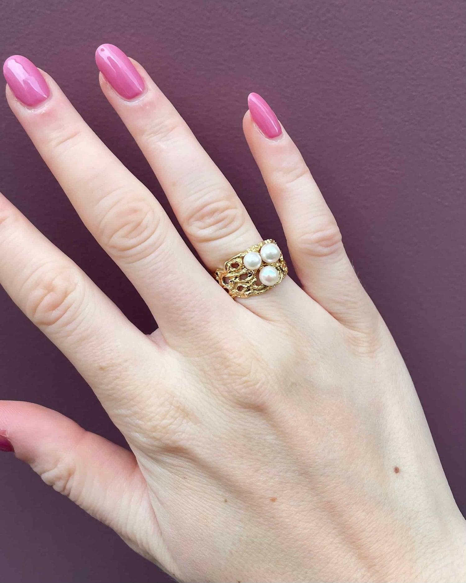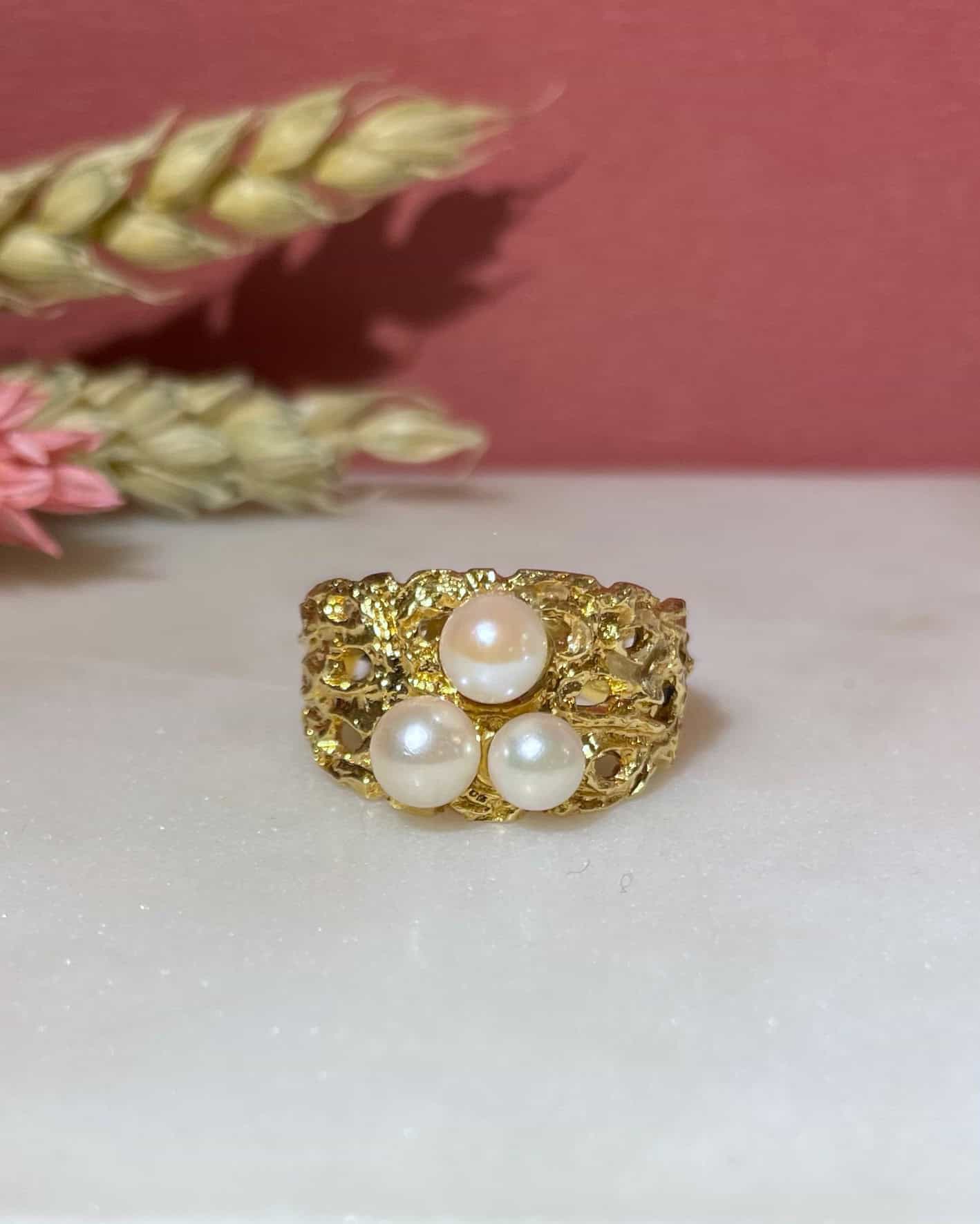 El anillo está engastado con tres suntuosas perlas, cuyo brillo suave y elegante añade un toque de refinamiento y sofisticación a esta excepcional pieza de joyería.