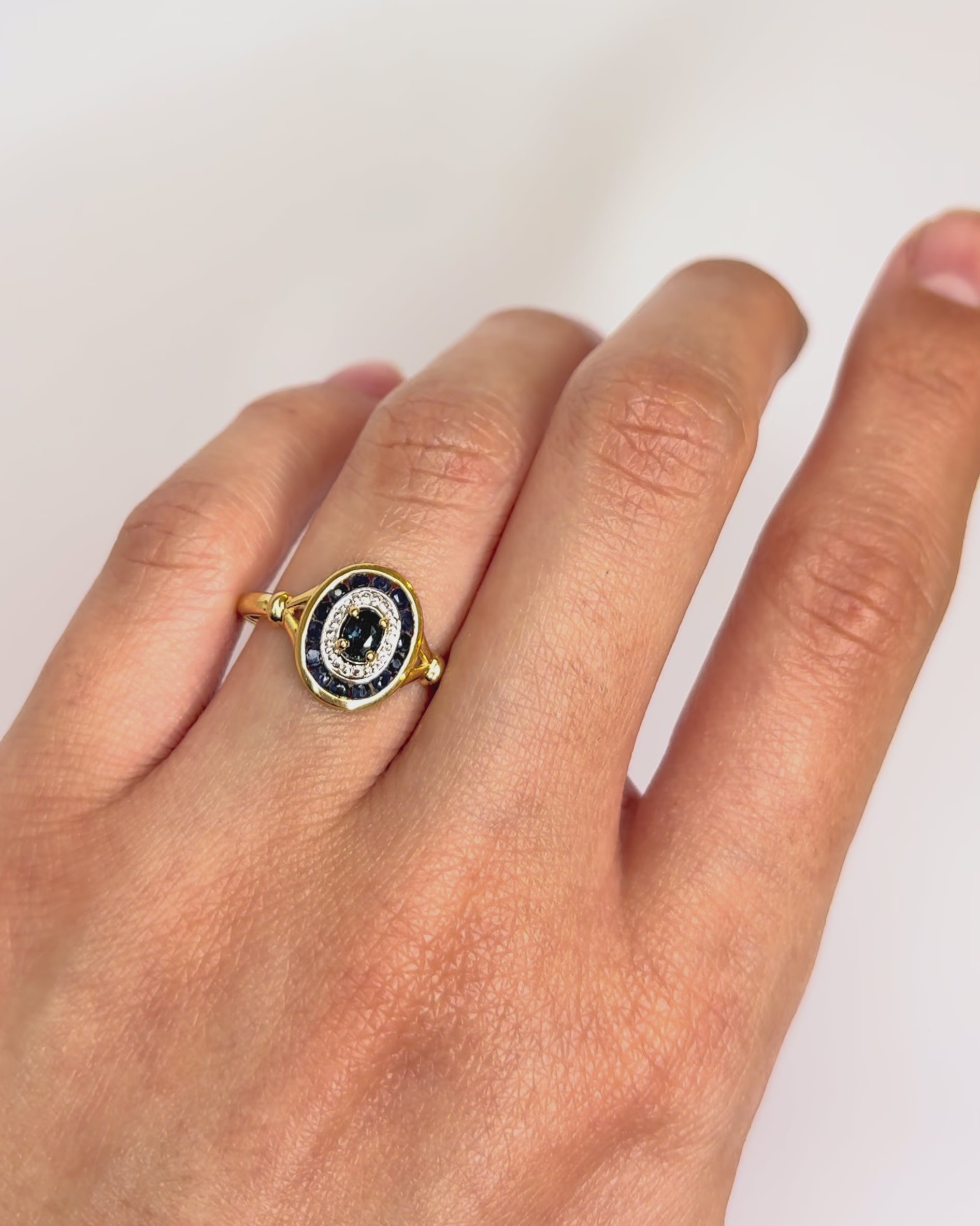 "Cindy" es un anillo de estilo Art Déco antiguo, elaborado en los años 1970 en oro amarillo y gris de 18 quilates. Su diseño geométrico de carácter y muy codiciado resalta un trabajo joyero de excepción. En su centro se encuentra un zafiro talla oval de 0.24 quilates, de un azul intenso. Está realzado por un halo de 14 zafiros que suman 0.28 quilates, destacado por un delicado trabajo en oro gris que confiere a este anillo antiguo un brillo cautivador.