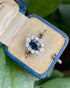 Su diseño atemporal está centrado en un suntuoso zafiro luminoso de 0,65 quilates, bellamente rodeado por diez diamantes brillantes que suman un total de 0,80 quilates.
