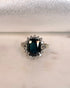 Ce saphir, d'un bleu-vert profond et éclatant, captive le regard par sa pureté et son intensité de couleur. L'entourage de diamants vient parfaire l'ensemble, apportant une brillance et une luminosité exceptionnelles.