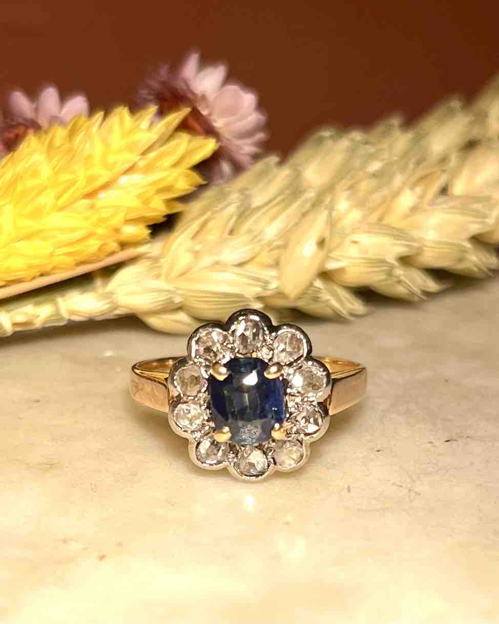 En su corazón descansa un hermoso zafiro azul de 0,68 quilates. Un séquito de diez diamantes talla rosa de 0,40 quilates en total completa el conjunto.