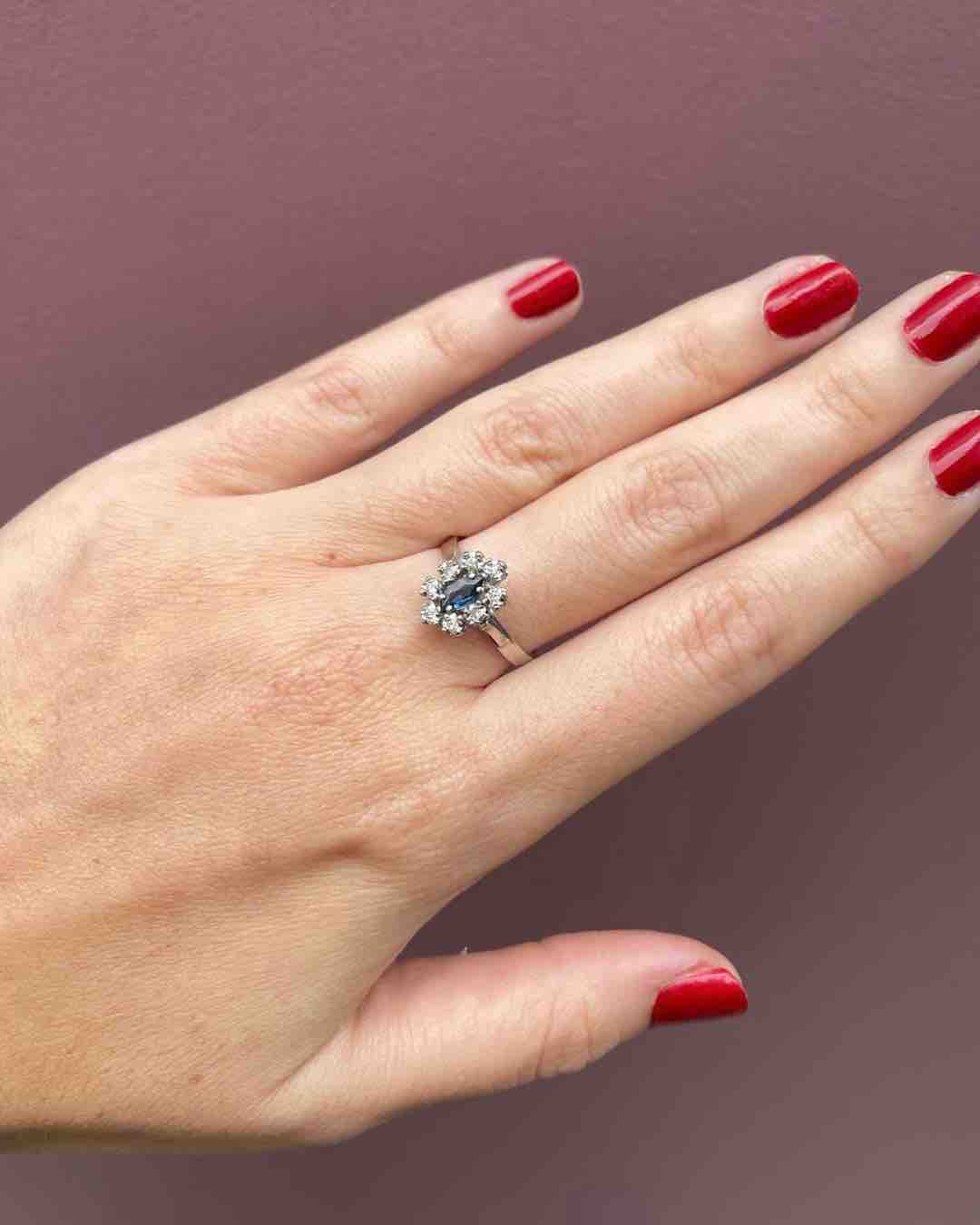 En su corazón descansa un majestuoso zafiro azul de 0,20 quilates, que le da a este anillo un aura de puro esplendor. La piedra central está realzada por ocho diamantes brillantes que suman un total de 0,08 quilates.