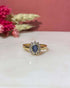 En el centro se encuentra un espléndido zafiro azul de 0,45 quilates, realzado por un marco de doce diamantes brillantes que suman un total de 0,24 quilates.