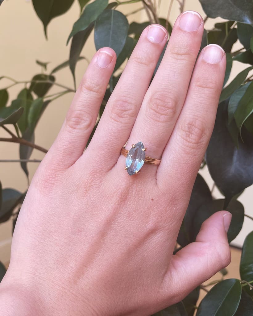 Está adornado con un espléndido topacio de talla marquesa de 5,44 quilates.