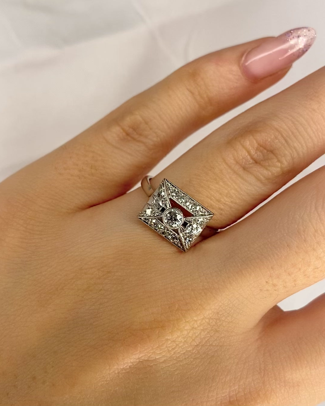 « Laura » es un suntuoso anillo Art Déco antiguo en platino, finamente elaborado por un joyero francés de los años 1930. Su motivo geométrico emblemático de la época revela en su centro un precioso diamante talla antigua, sutilmente realzado por doce diamantes talla 8/8, sumando en total 0,43 quilates.