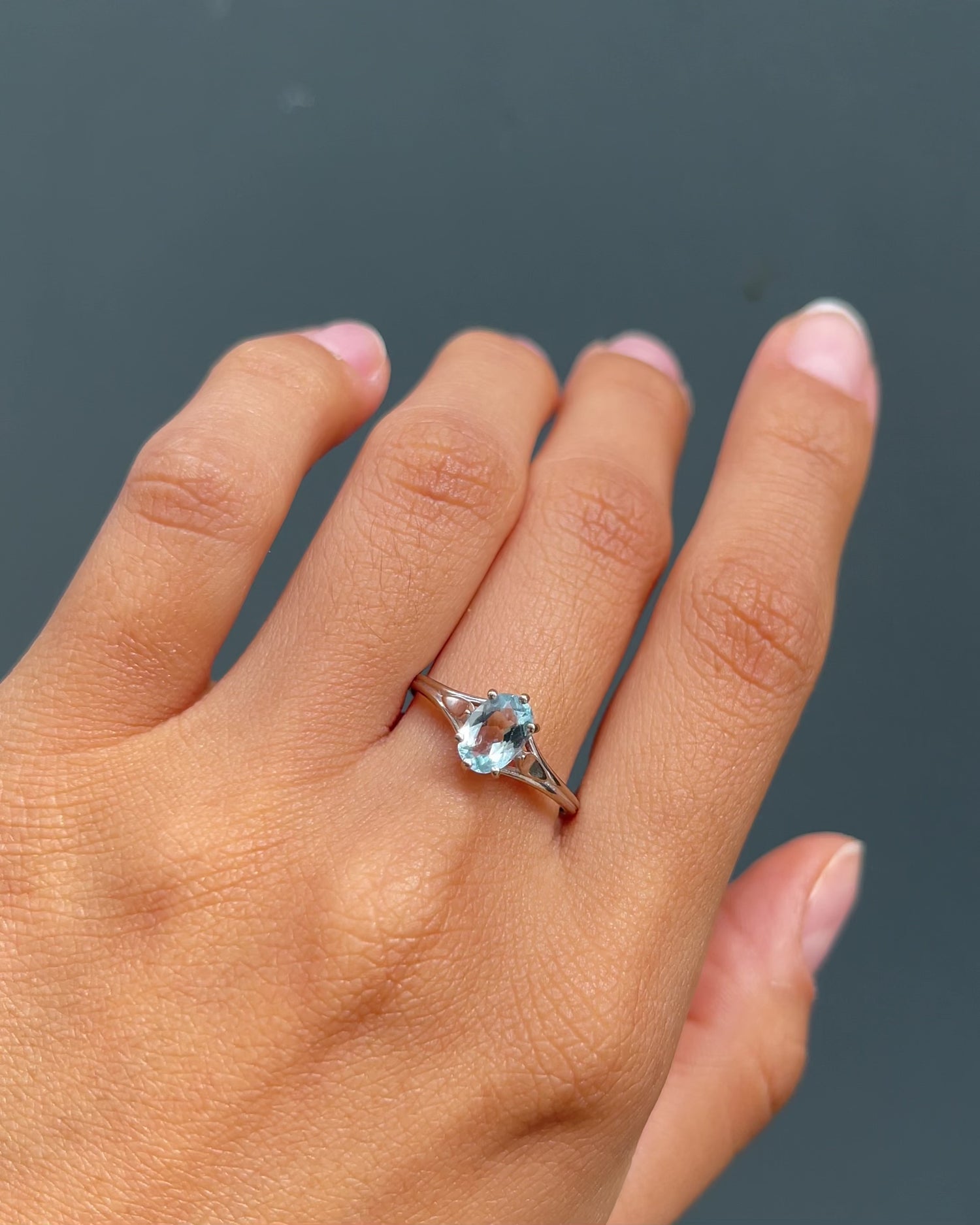 L'aigue-marine, pierre réputée pour ses nuances bleutées apaisantes, confère à ce bijou une harmonie et un éclat naturel. Le style "solitaire" de cette bague en fait un accessoire sophistiqué et intemporel, idéal pour célébrer une occasion spéciale.
