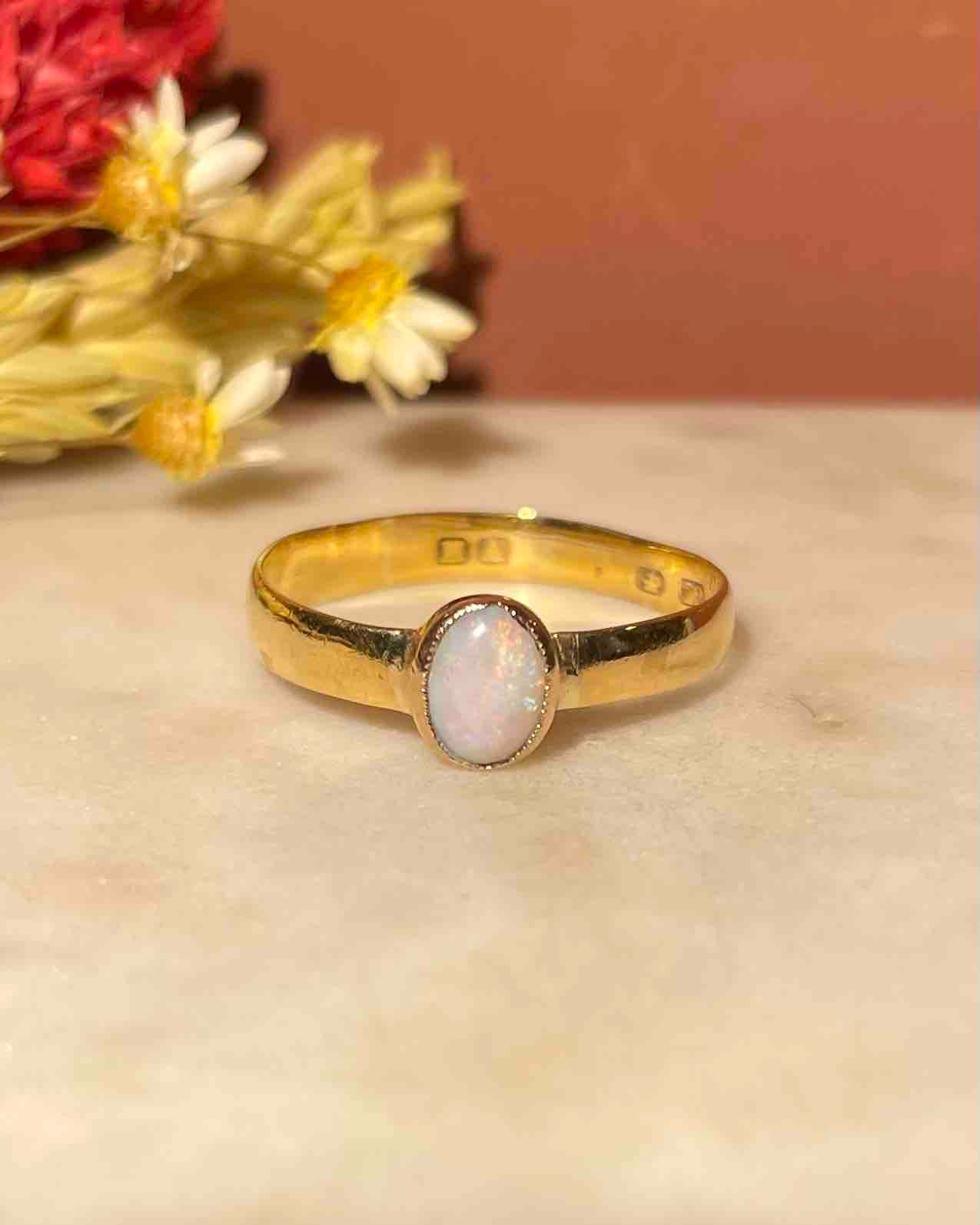 El encantador anillo vintage "Nancy" de la década de 1980 está adornado con un ópalo de 0,40 quilates con reflejos brillantes.