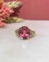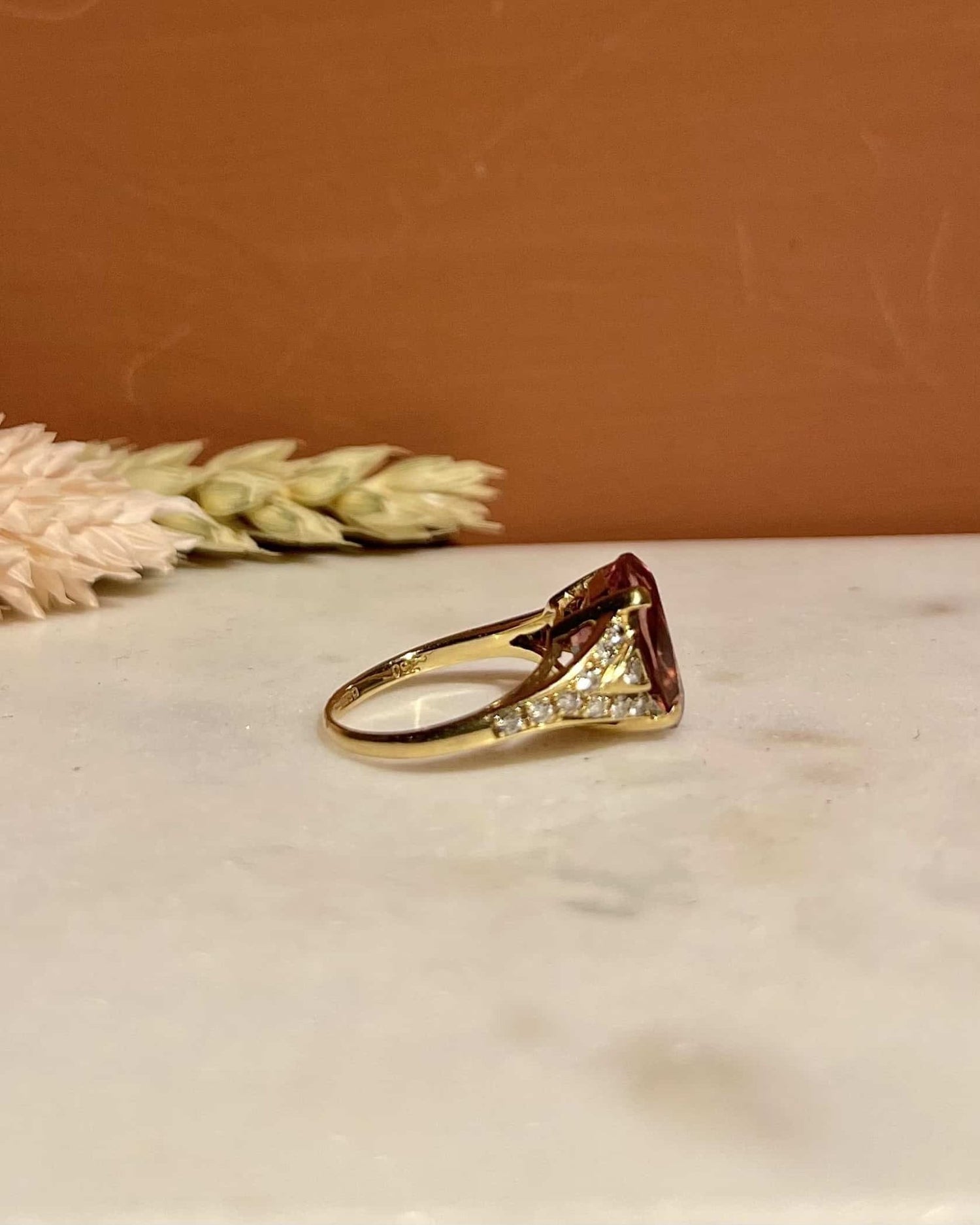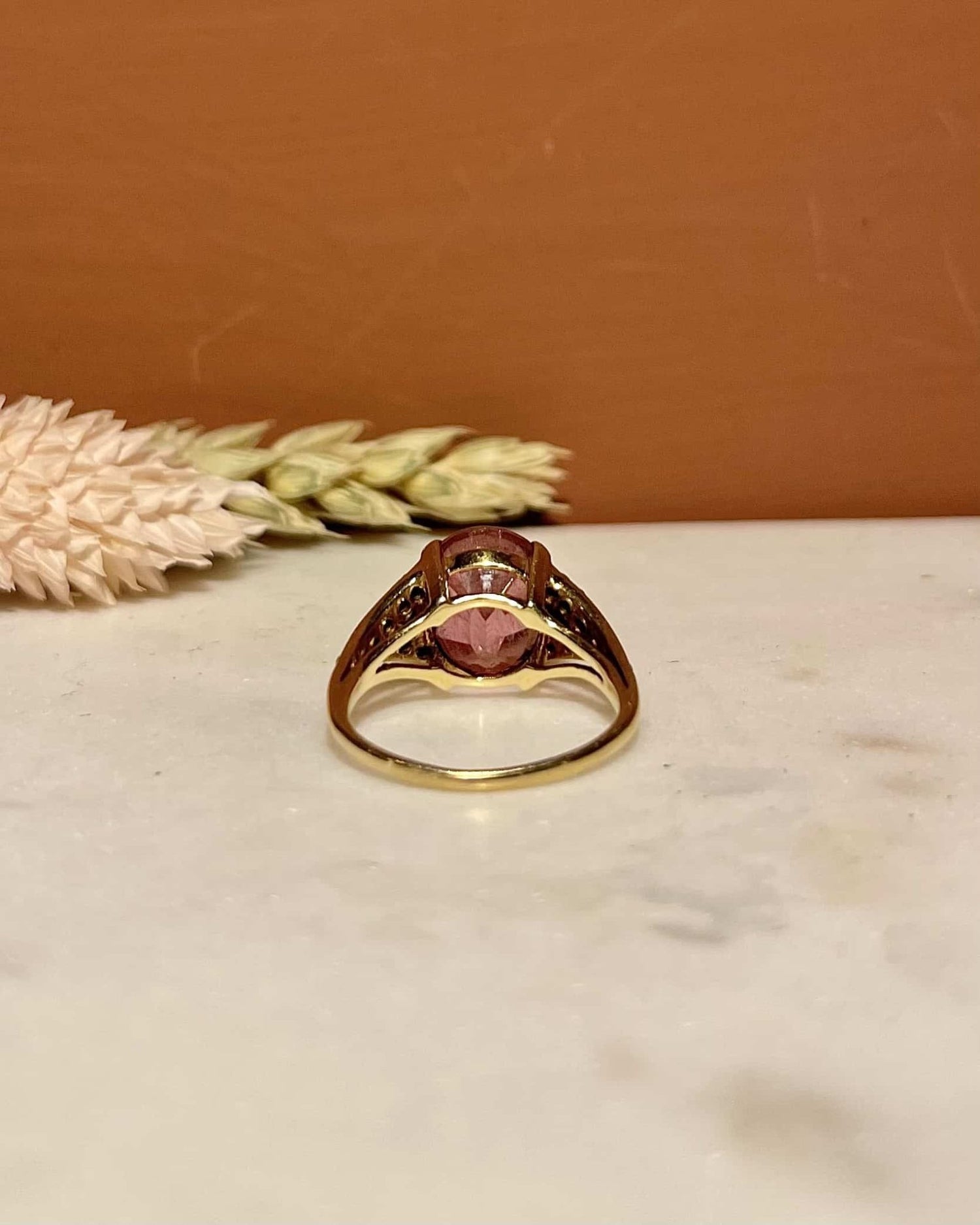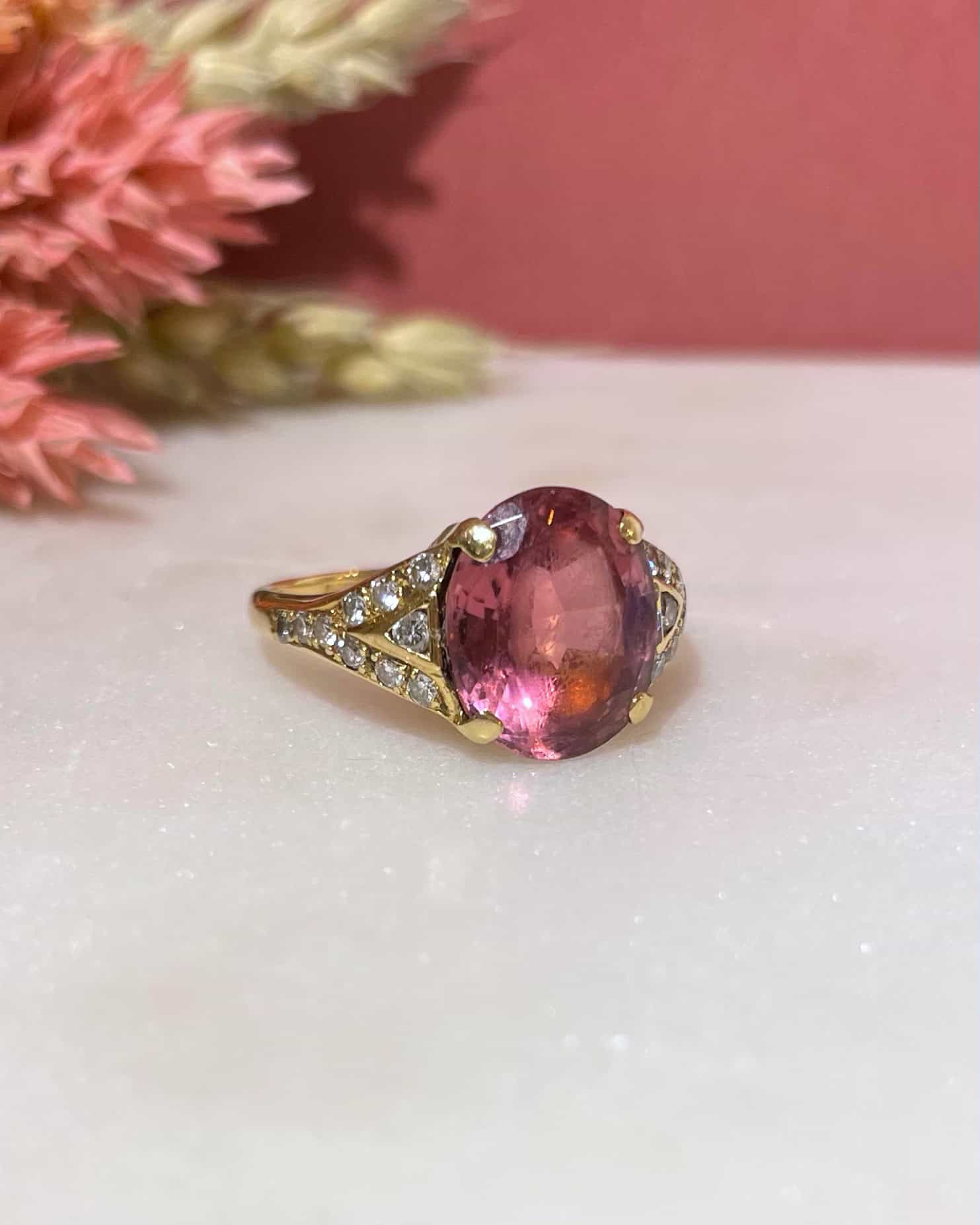 Su anillo, cuidadosamente elaborado en oro amarillo de 18 quilates, alberga una divina turmalina rosa de 4,20 quilates.