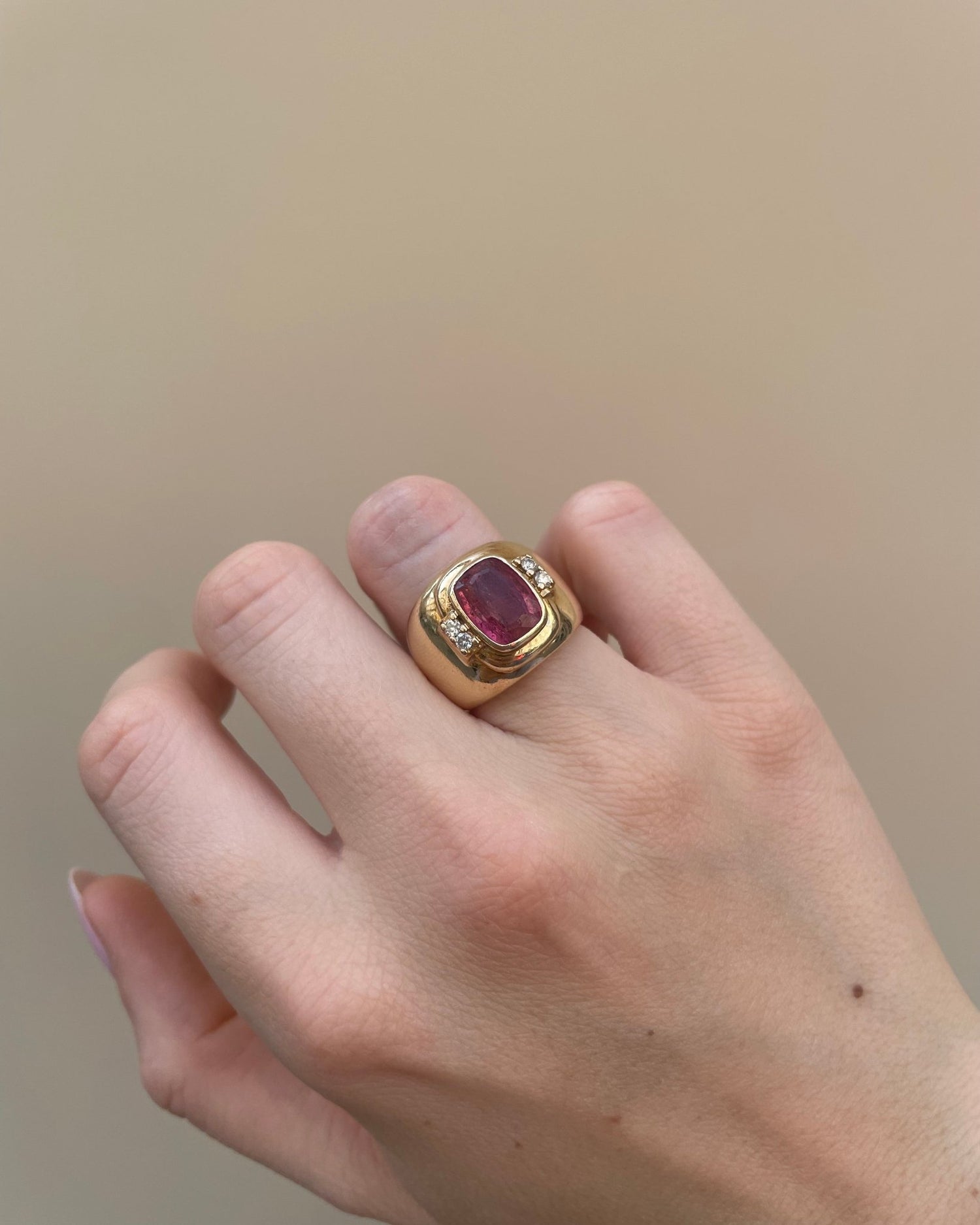 "Arielle" une est bague jonc délicate des années 1980 en or jaune 14 carats qui met à l'honneur la tourmaline rose, une pierre rare et précieuse reconnue pour ses nuances vibrantes allant du rose doux au fuchsia intense.