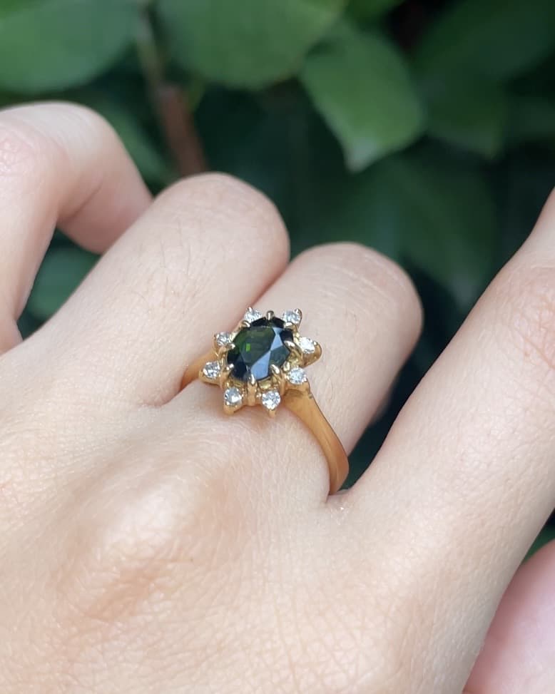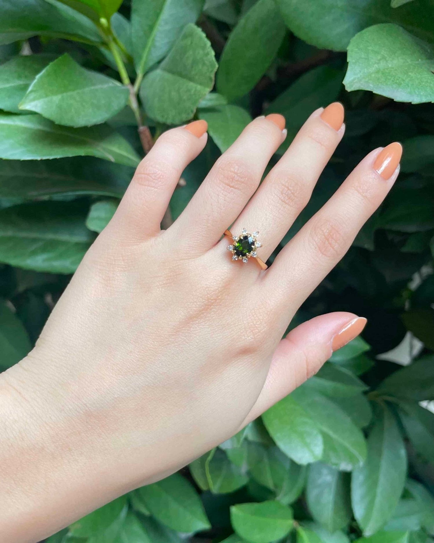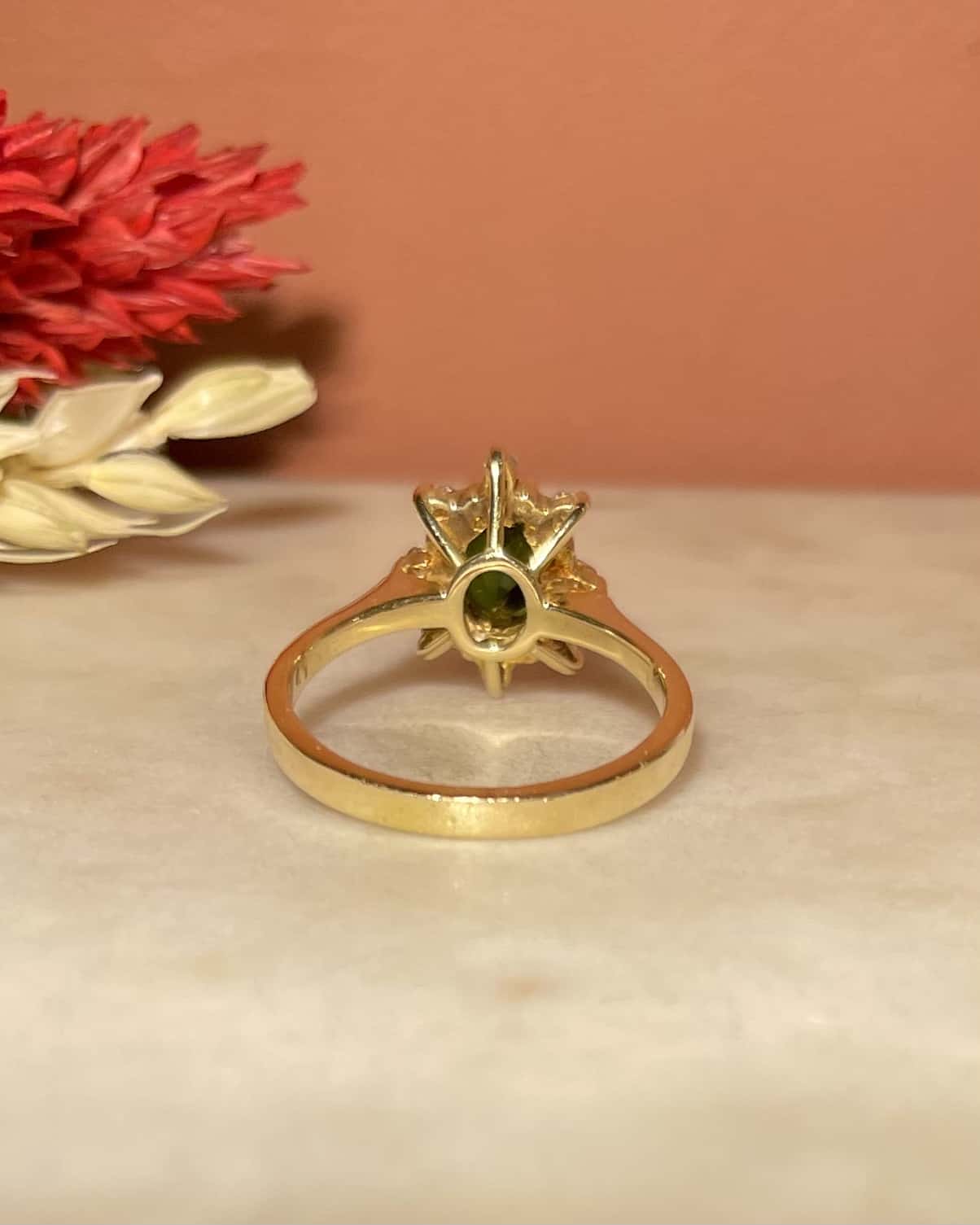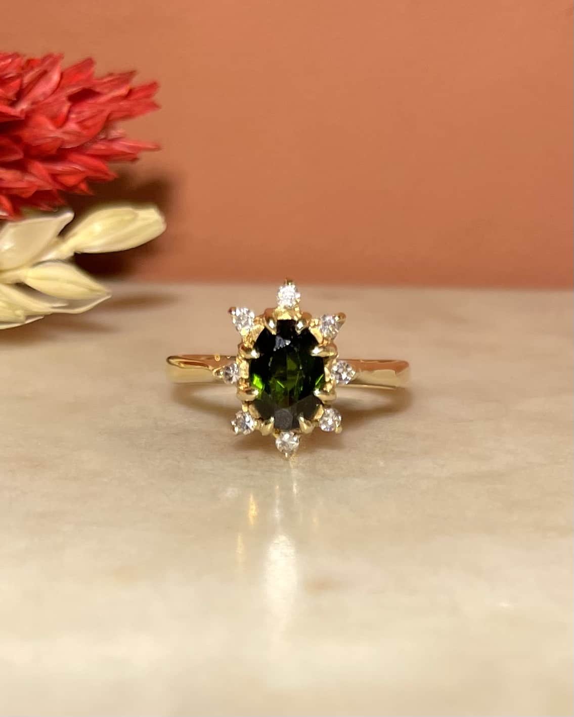 Anillo “Sunniva” con turmalina verde y margarita de diamantes