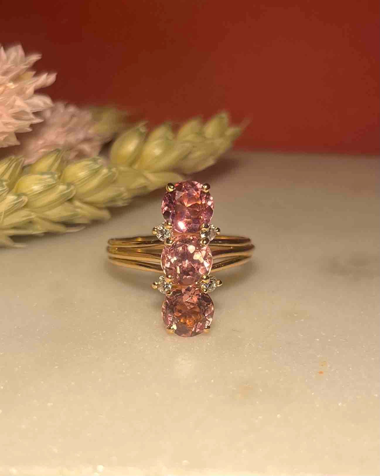 El exclusivo anillo vintage "Rosalia", obra maestra del maestro joyero, encarna la elegancia atemporal de creaciones excepcionales. Finamente elaborado en oro amarillo de 18 quilates, resalta tres suntuosas turmalinas rosas de notable brillo, con un total de 2,70 quilates.