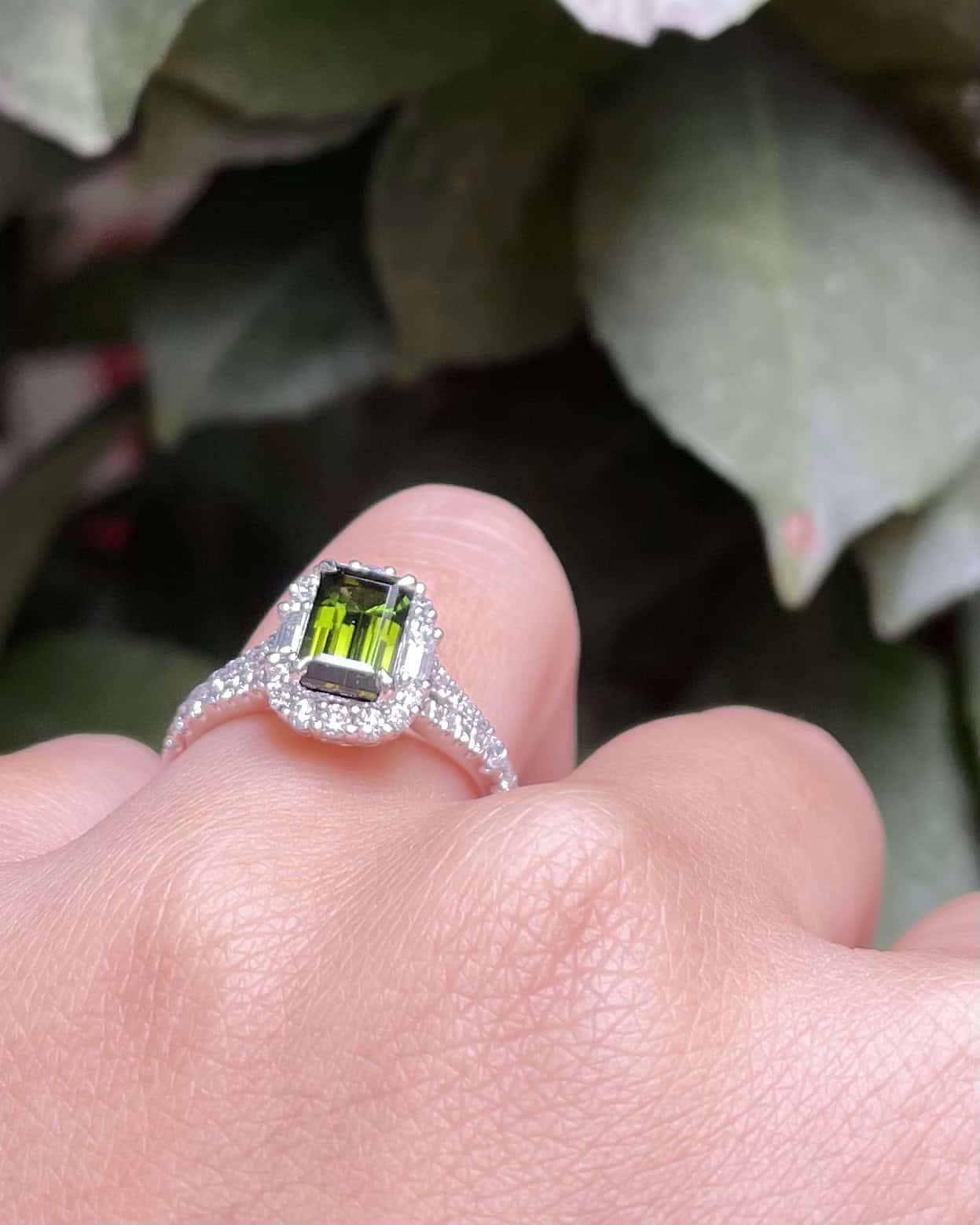 Esta joya finamente tallada está centrada con una suntuosa Turmalina de 1,47 quilates de un magnífico color verde con reflejos deslumbrantes. La turmalina es la piedra de nacimiento de octubre, conocida como una piedra calmante.