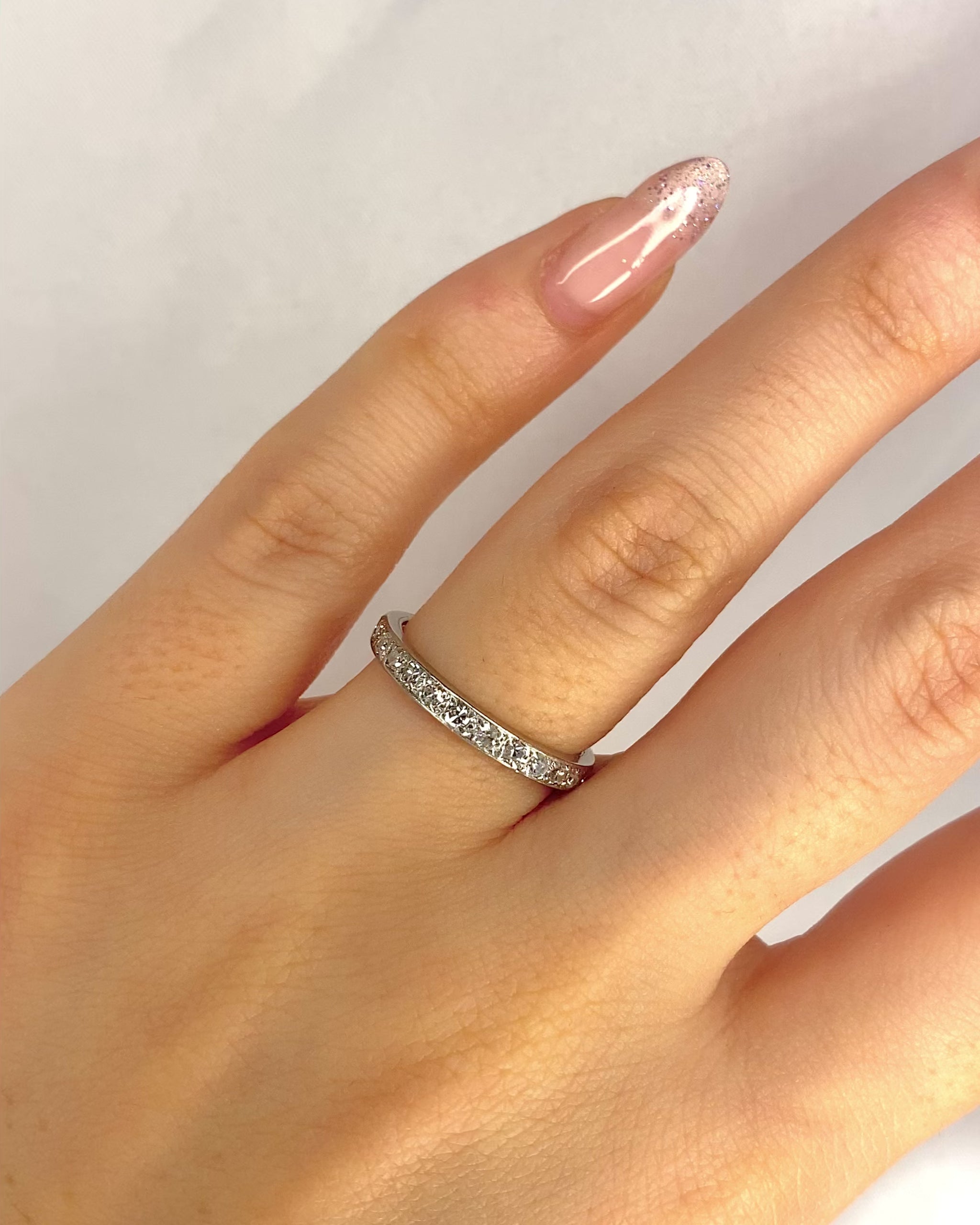 El anillo "Mariella" es una alianza americana vintage Art Déco, elaborada en platino en los años 1930. Está engastado con 26 diamantes que suman un total de 0.52 quilates, lo que le otorga un brillo único. Este anillo antiguo encarna la tradición joyera con elegancia y distinción.