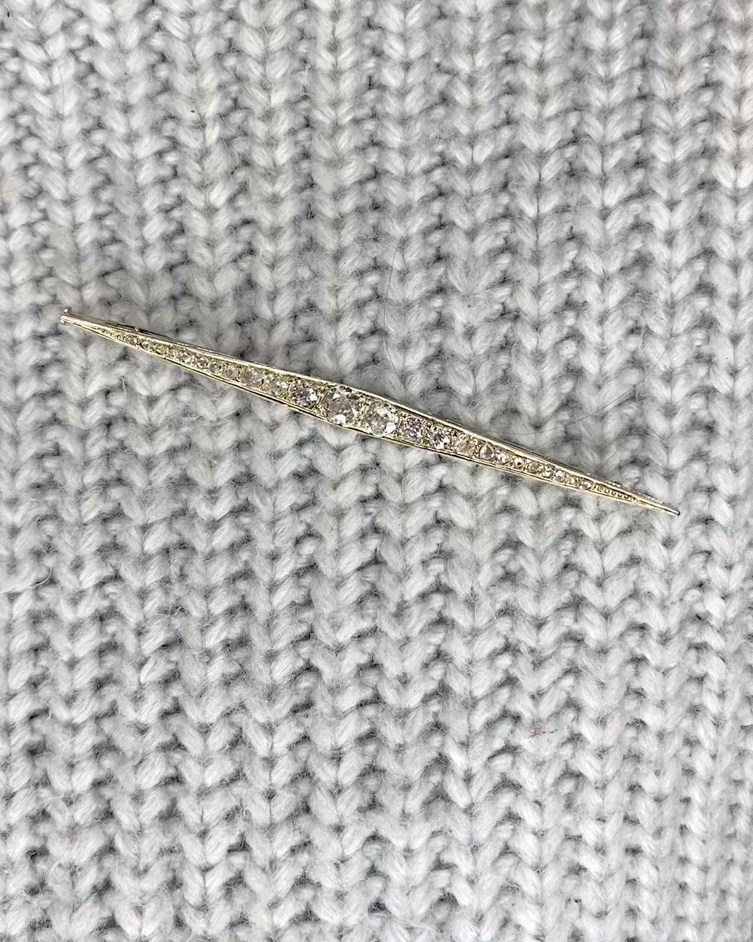 "Diane" es un magnífico broche Art Déco antiguo, finamente elaborado en oro gris de 18 quilates en los años 1920. Finamente cincelado, está engastado con ocho diamantes talla antigua y dieciséis diamantes talla rosa, sumando un total de 1,35 quilates. El sutil contraste entre las tallas, típico de las creaciones de la época, crea un juego de luces vibrante, a la vez estructurado y delicado.