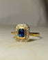Son pavage de six diamants contraste avec un merveilleux saphir azur de 0,50 carat.