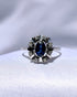 Elle est sertie d’un saphir d’un bleu profond, dans un entourage de huit diamants et de sublimes pétales.