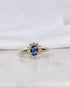 "Adele" est une bague marguerite vintage des années 1970 en or jaune 9 carats, centrée d’un superbe saphir bleu profond de 0.38 carat. Il est sublimé par un éclatant halo de 12 diamants totalisant 0.36 carat, dans un design floral emblématique des bijoux anciens.