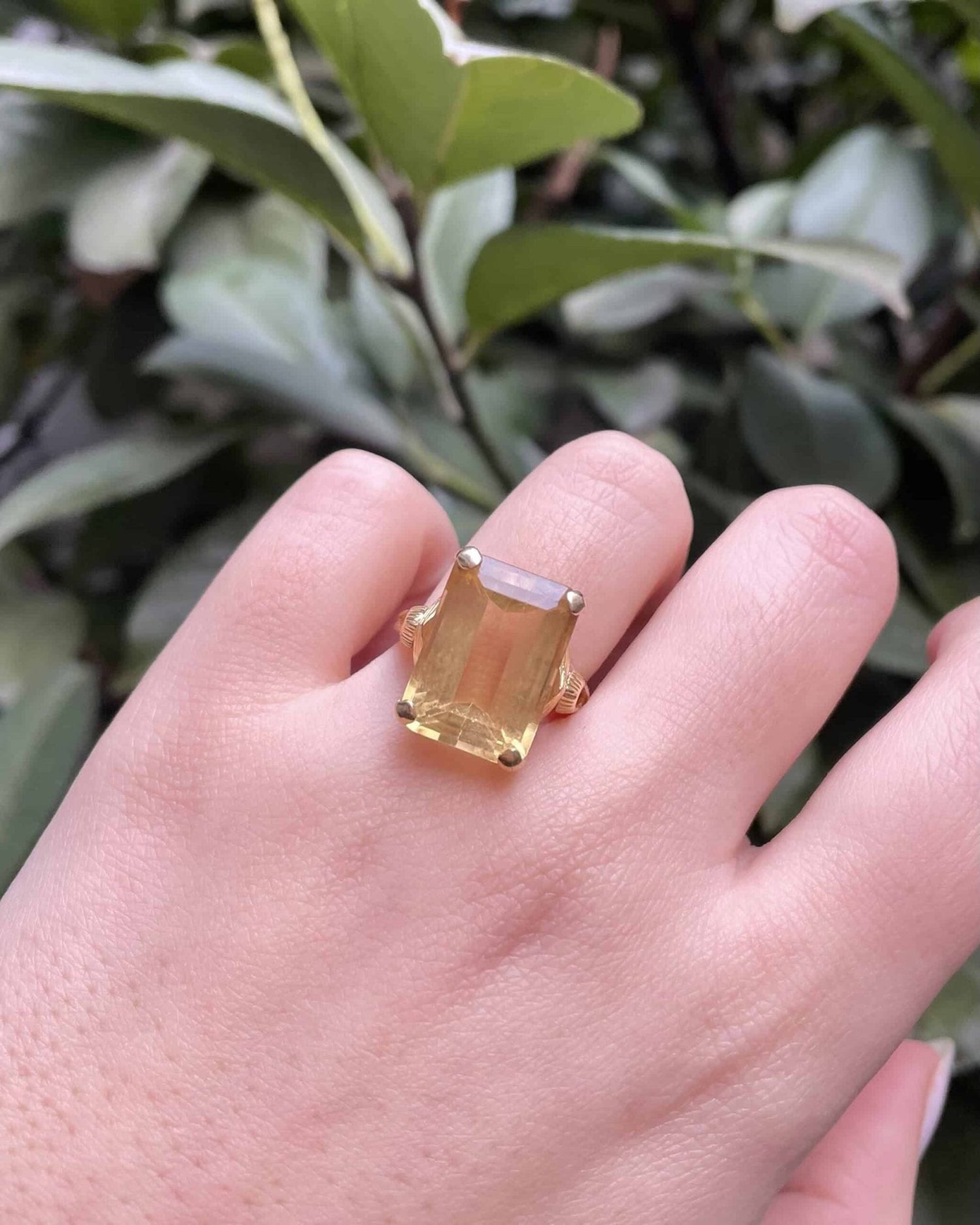 Elle est habillée d’une Citrine rectangulaire, couleur miel, éblouissante de 9.20 carats . L’association de l’or jaune et de la citrine crée une harmonie parfaite, apportant à cette bague une élégance intemporelle et un éclat unique.