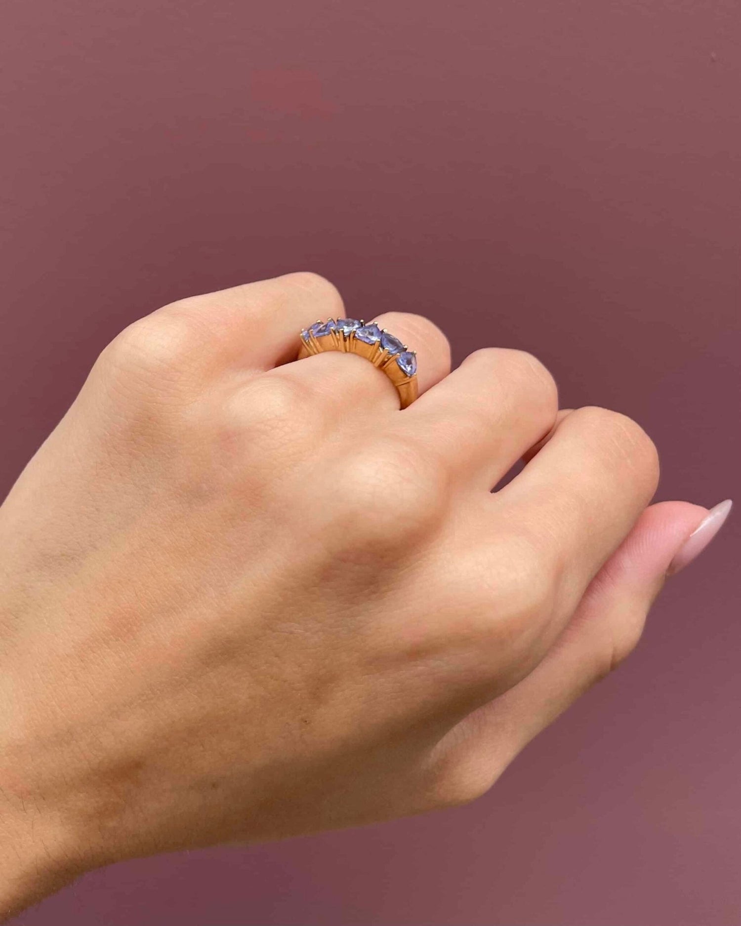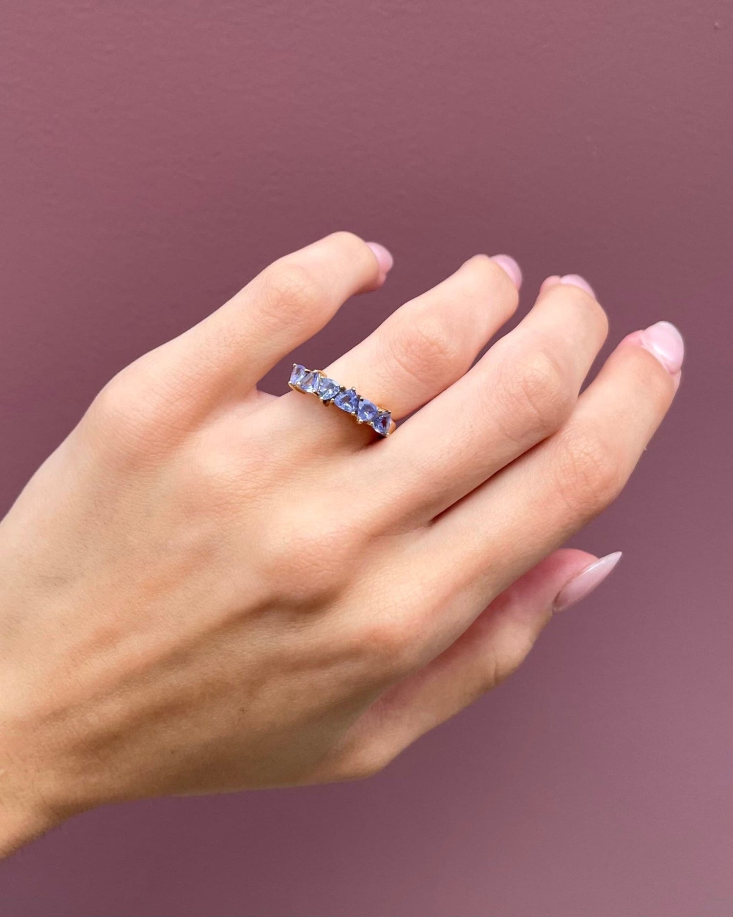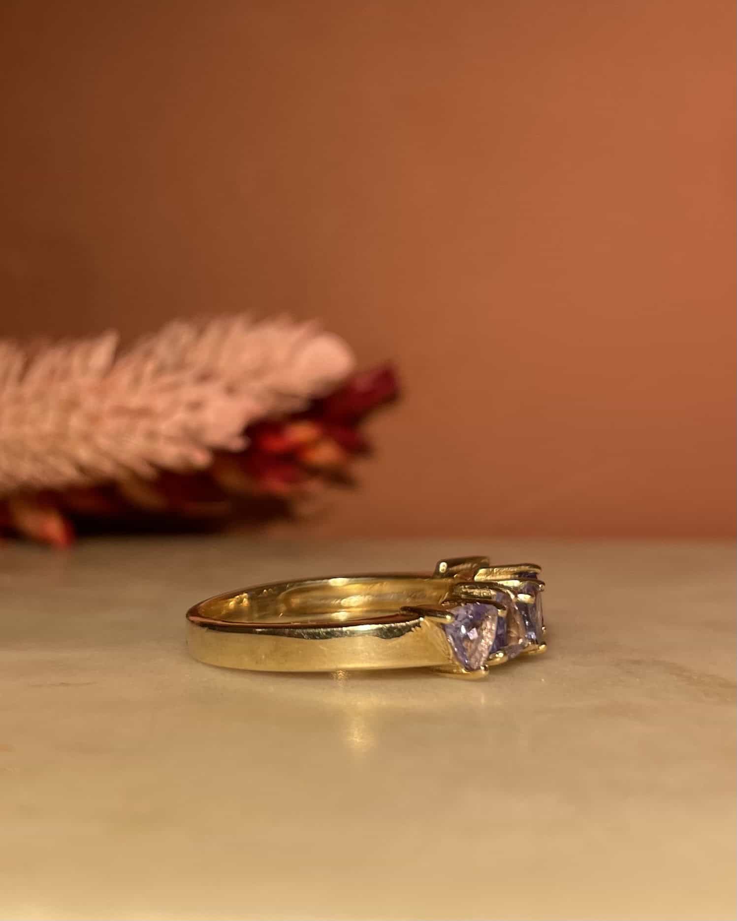 « Vayk » incarne la splendeur intemporelle avec une bague rivière vintage des années 1980 en tanzanites qui charme par sa grâce et son apaisement.