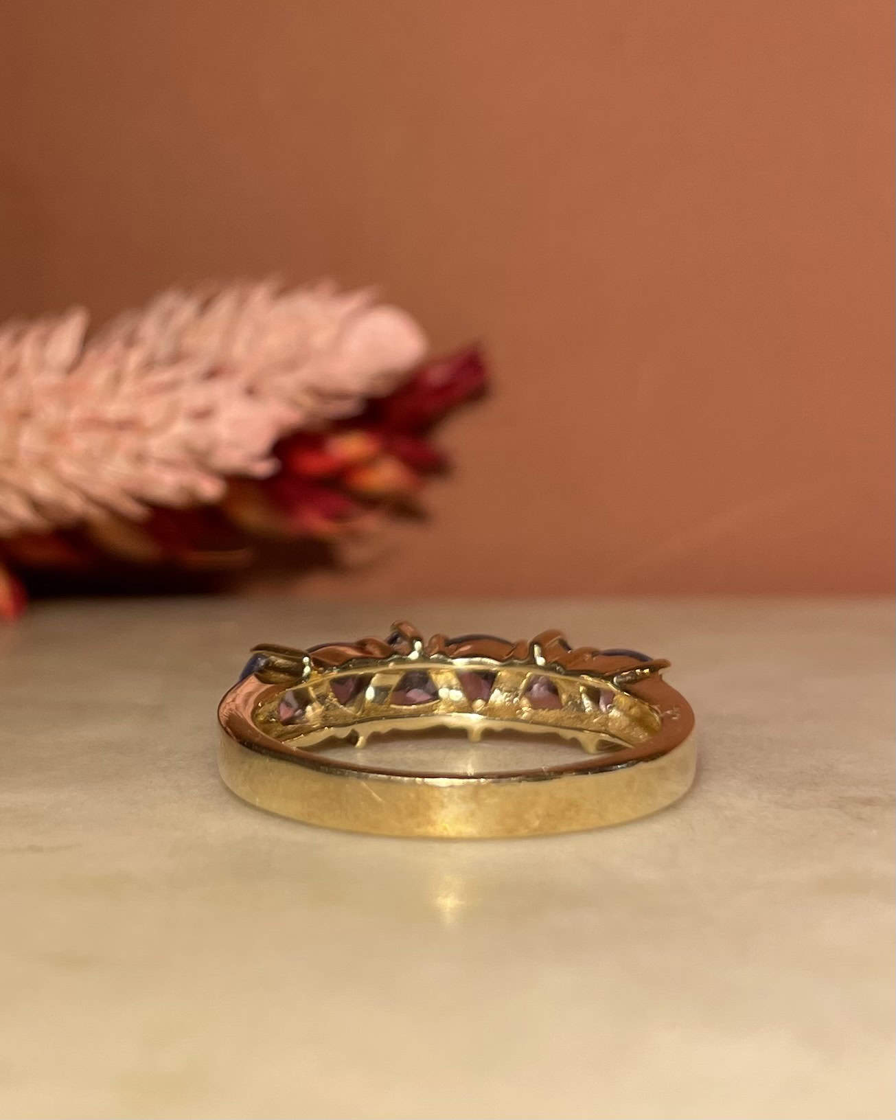 Son anneau, un travail de délicatesse, est façonné en or jaune 9 carats, ajoutant une lueur chaleureuse à cette création d’une finesse exceptionnelle.