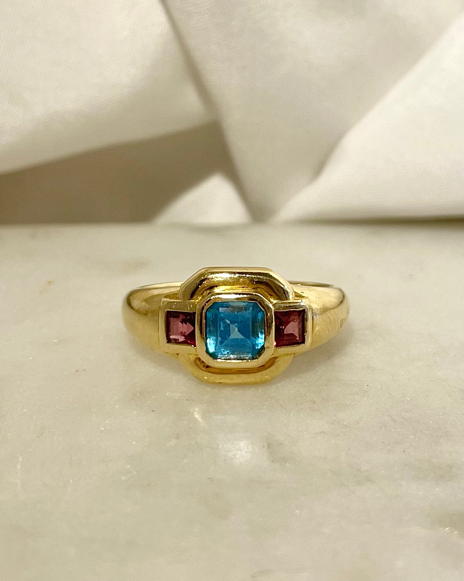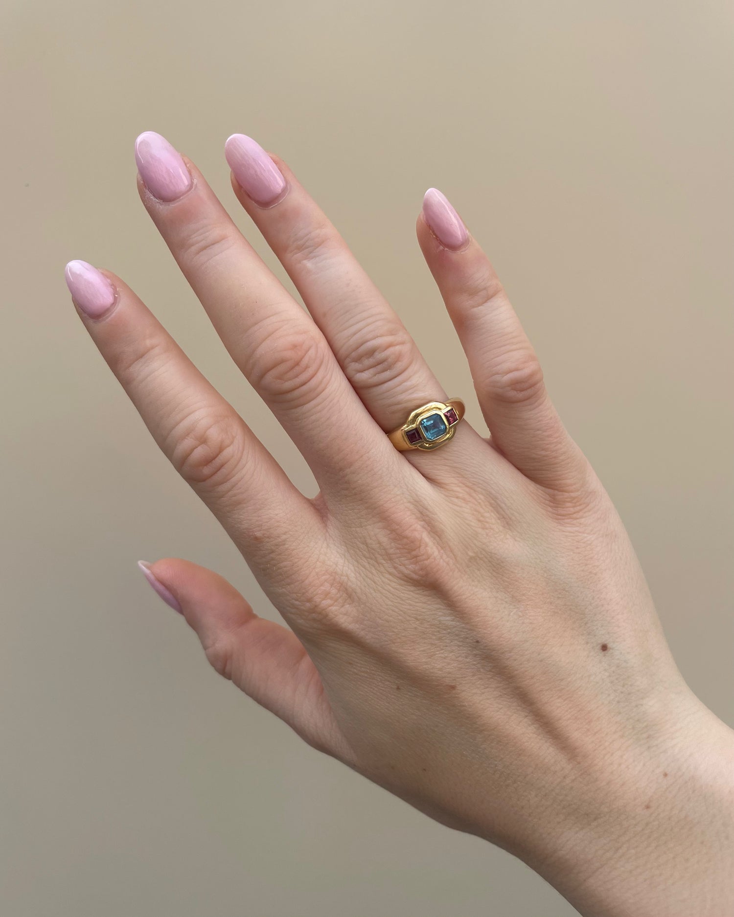 Deux magnifiques tourmalines roses, totalisant 0.20 carat, encadrent délicatement la pierre centrale. Cette association de couleurs vives et de formes harmonieuses confère à ce bijou une élégance vintage intemporelle.