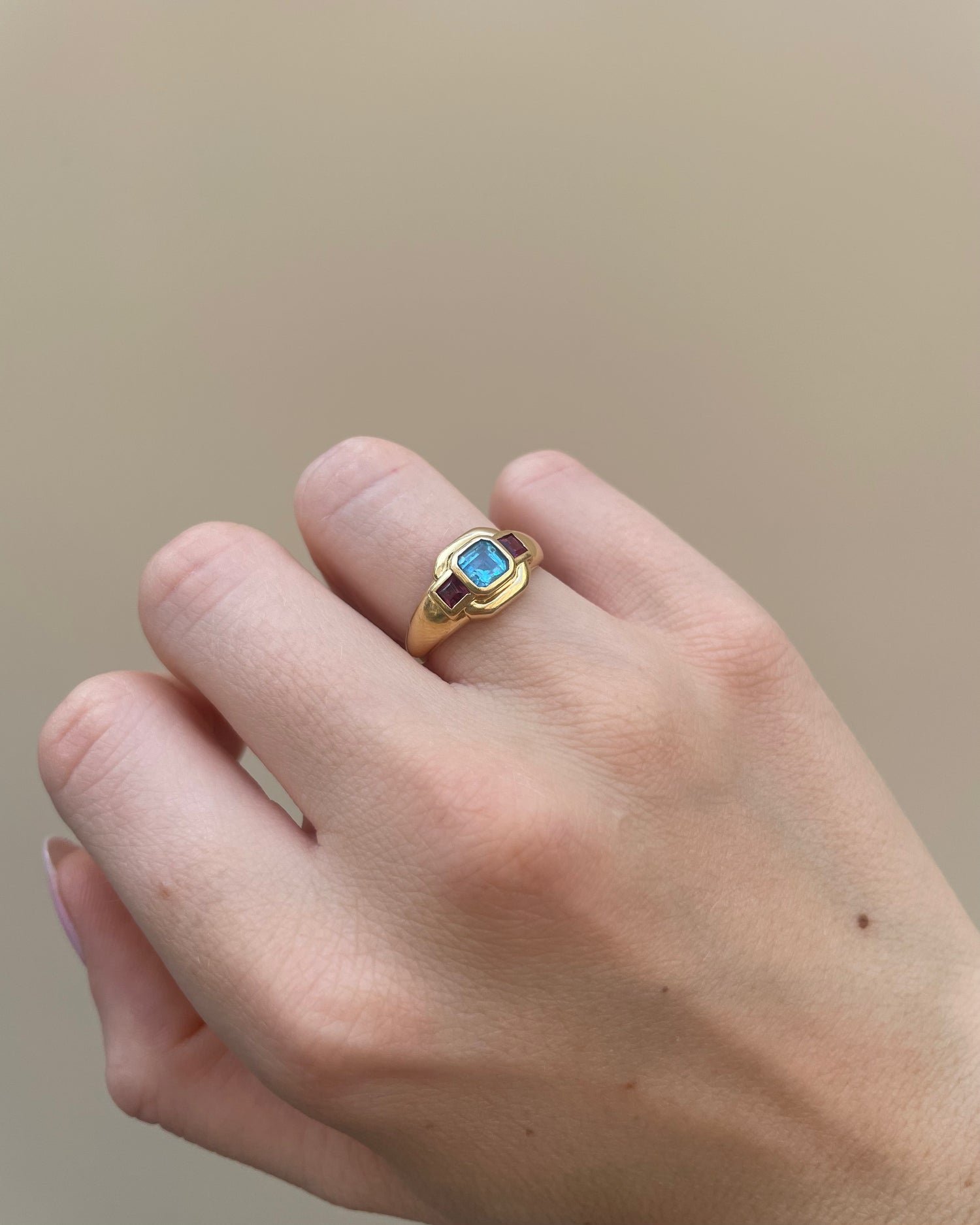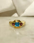 "Linette" une bague jonc trilogie en or jaune 18 carats est une création des années 1980. Au centre trône une sublime topaze bleue de 0.86 carat, qui évoque le ciel dégagé et la tranquillité par sa couleur claire et brillante.