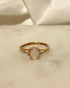 "Manoa" est une bague trilogie vintage au charme doux et romantique, délicatement façonnée en or rose 9 carats. Elle met en valeur un joli quartz rose central de 0.75 carat, symbole de tendresse, encadré de huit diamants scintillants totalisant 0.04 carat.