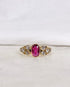 Délicatement façonnée en or jaune 18 carats, elle met en lumière un merveilleux rubis rouge de 0.75 carat. Huit diamants taille ancienne totalisant 0.50 carat encadrent cette gemme aussi exceptionnel que rare.
