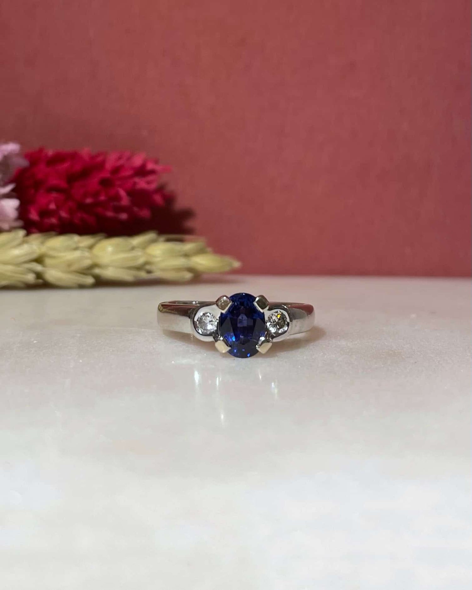Cette création délicate est centrée d’un merveilleux saphir bleu de 1.25 carat, épaulé de deux diamants de 0.10 carat au total qui viennent illuminer l’ensemble.