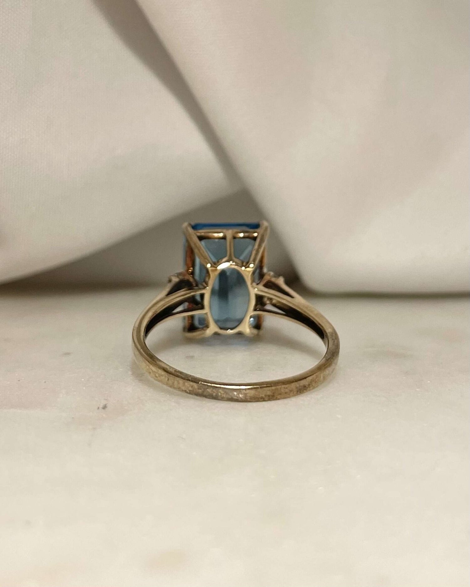 "Greta" est une bague trilogie vintage des années 1970, façonnée en or jaune 9 carats et sertie d’une topaze bleu ciel de 8.30 carats et de quatre diamants scintillants totalisant 0.04 carat. Ce bijou ancien incarne l’élégance, parfait en cadeau, bague de naissance ou pièce de collection.