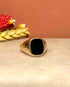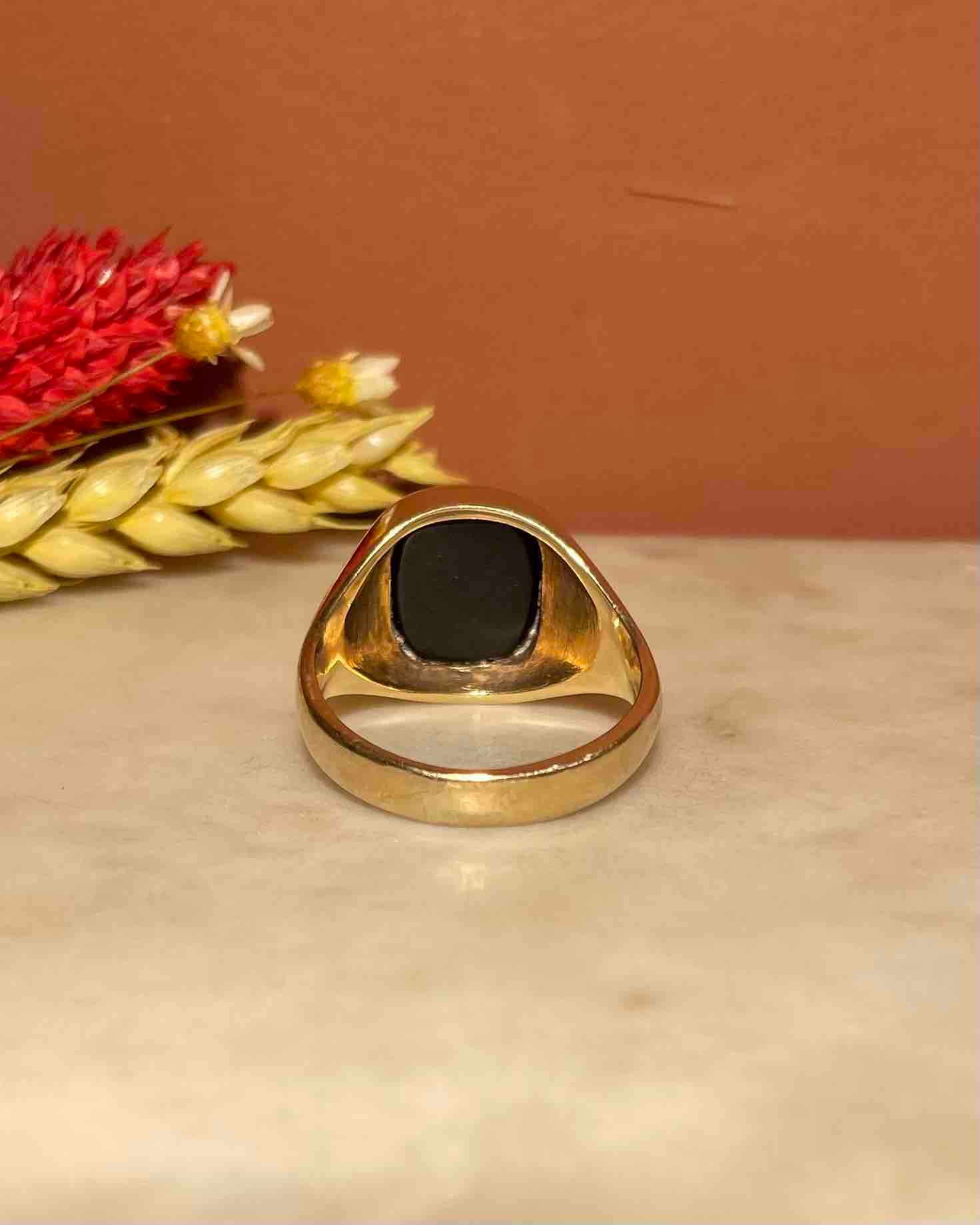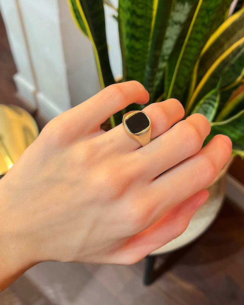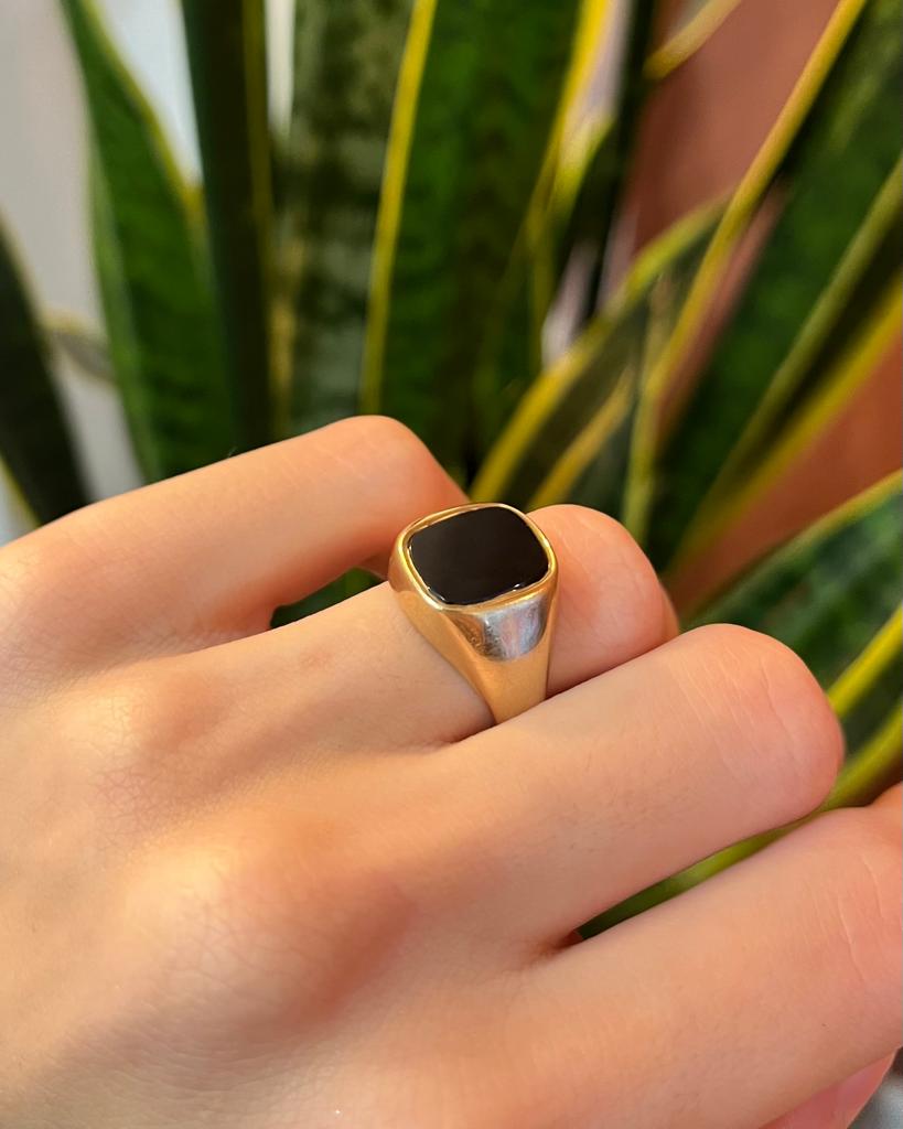 Son plateau finement travaillé met en valeur un Onyx noir profond en forme de coussin carré plat, idéal à porter au quotidien.
