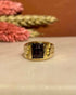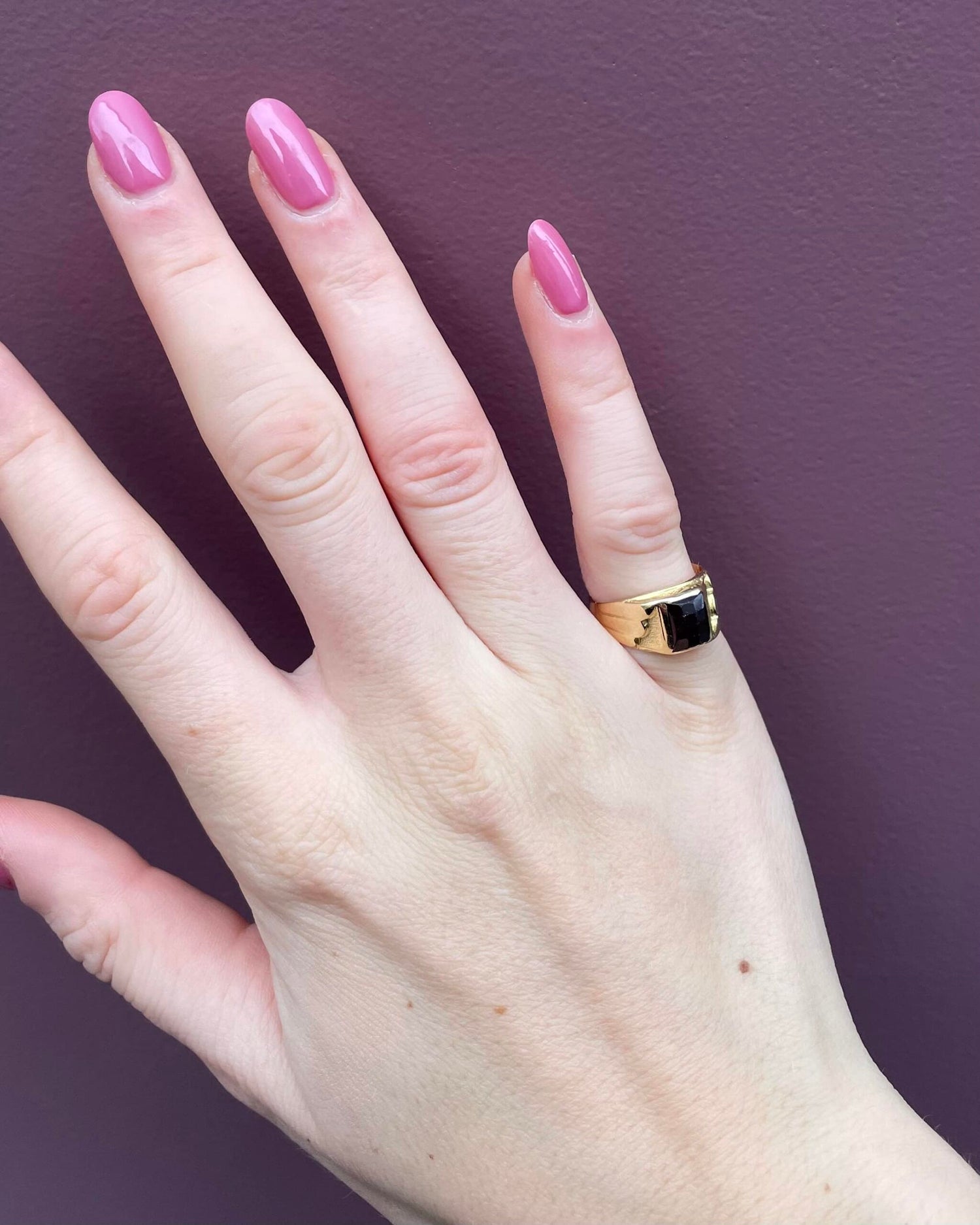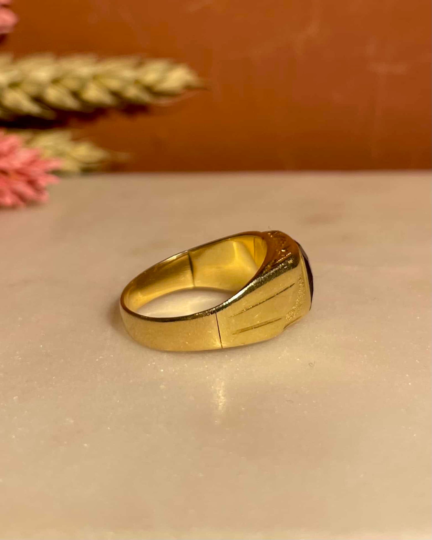 Façonnée en or jaune 18 carats, elle est ornée d’un grenat central de 0.70 carat, dont la teinte profonde apporte une touche de chaleur et de mystère.
