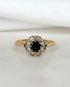 "Arlette" est une élégante bague marguerite vintage, finement façonnée en or jaune et gris 18 carats. Elle présente en son cœur un saphir bleu de 0.50 carat à la couleur intense, épaulé d'un lumineux halo de 8 diamants de 0.08 carat au total. Une bague ancienne pleine de charme et intemporelle, très agréable à porter au quotidien.