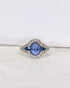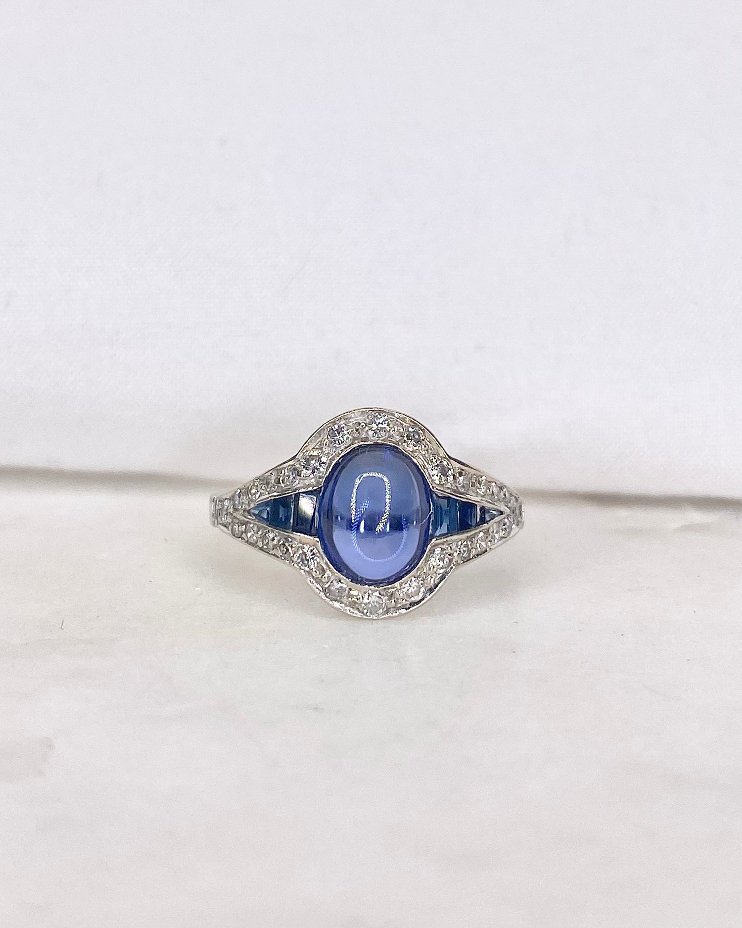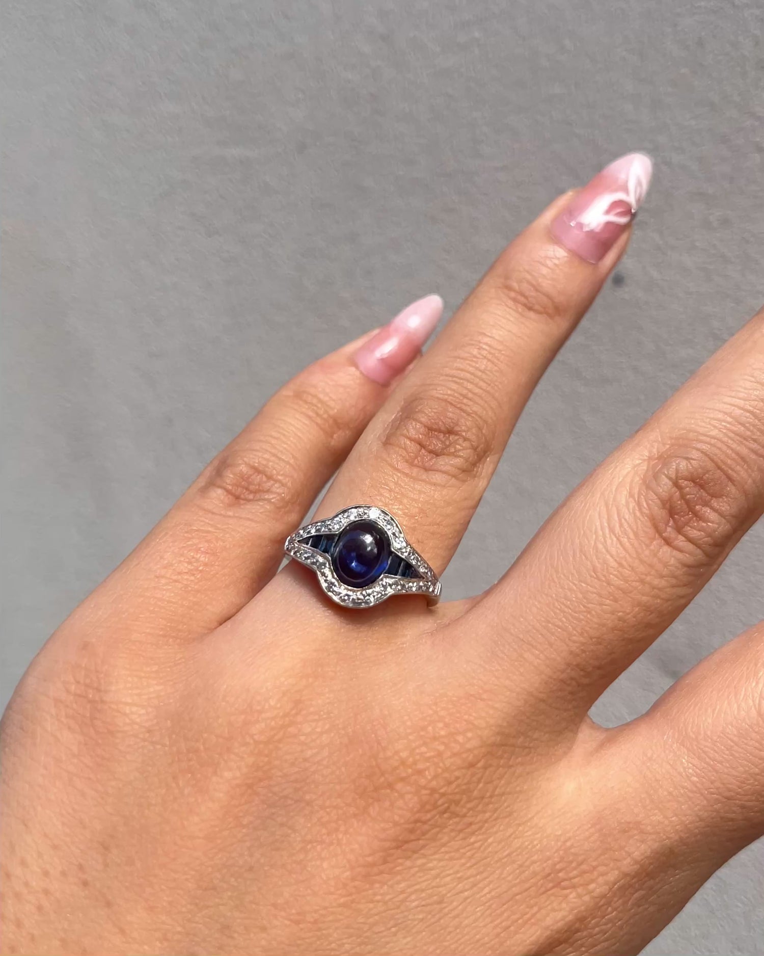 La bague "Sereen" est une création style Art deco de maître joaillier français des années 1940, façonnée en or gris 18 carats. Elle met en scène un magnifique saphir cabochon central de 2 carats, entouré avec élégance de 6 saphirs calibrés de 0.12 carat au total et 28 diamants totalisant 0.42 carat.
