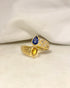 "Mewen" est une bague Toi et Moi vintage en or jaune 18 carats, façonnée avec soin et élégance. Elle met en lumière deux pierres centrales rares et précieuses : un saphir jaune et un saphir bleu, totalisant 1.10 carat. Ces gemmes lumineuses sont sublimées par un délicat pavage de 12 diamants scintillants pour un total de 0.24 carat.